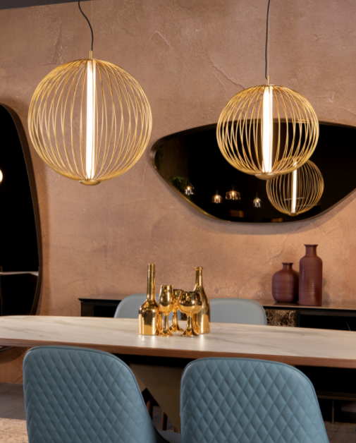 Lampada boule con un tubolare luminoso nel centro delle sfere, sospese da un