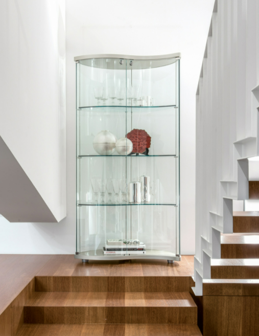 Ripiano dopo ripiano, Oregina si sviluppa verso l'alto, in un connubio di curve e verticalità. Le colorazioni della struttura, che vanno dal bianco al nero, al salvia, alle essenze legno noce Canaletto e rovere, sono in grado di renderla perfetta per ogni ambiente. L'illuminazione al LED inclusa, infine, impreziosisce con la luce gli splendidi spazi in vetro curvato.