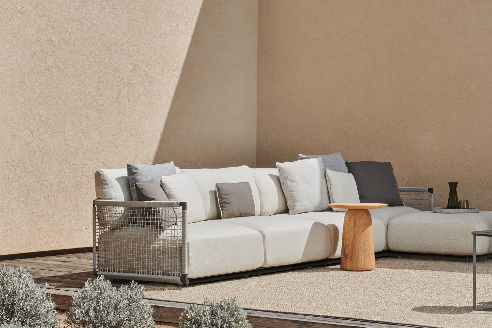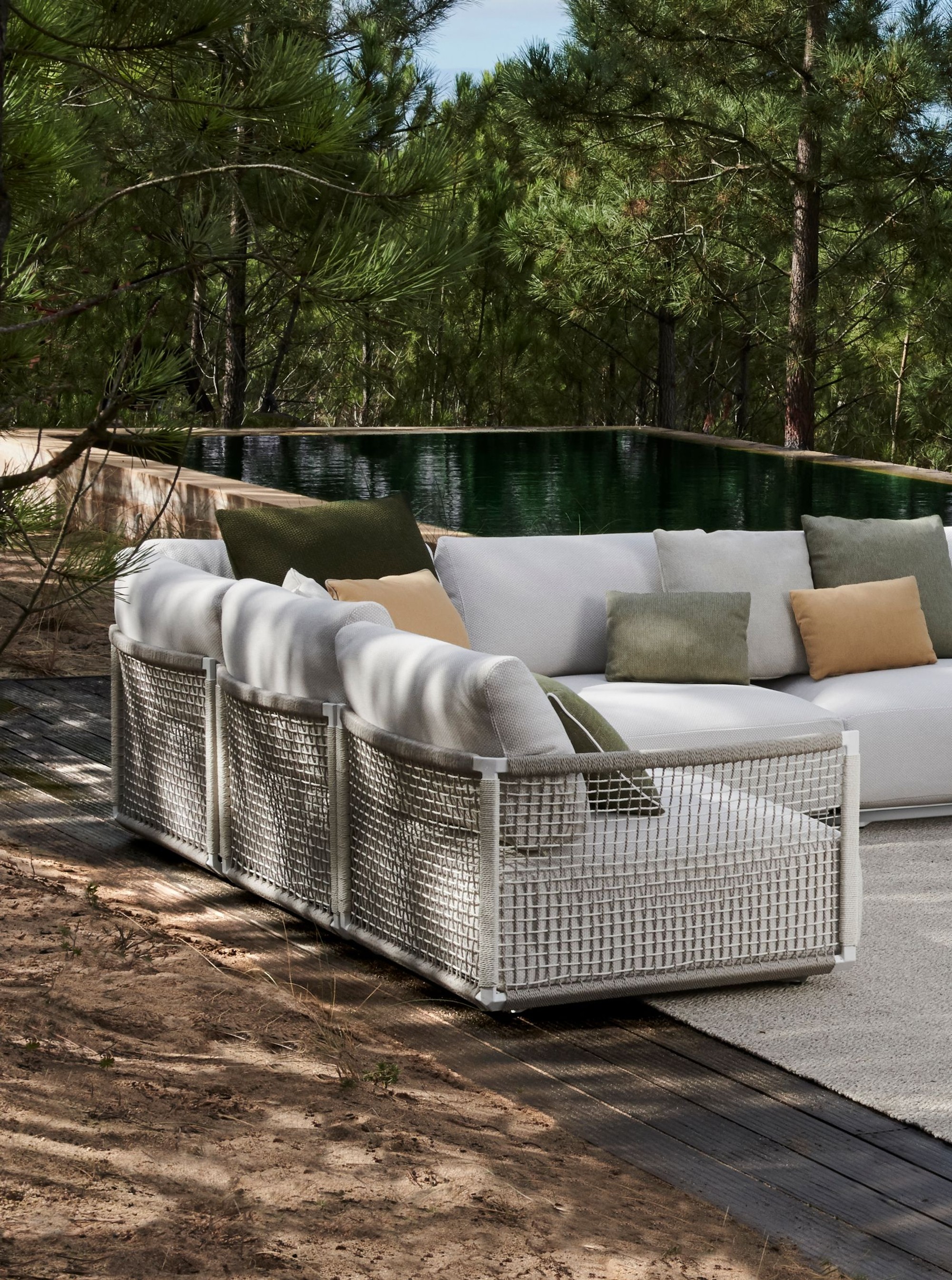 The modular Nodi sofa has a strong personality, yet it sits easily in an outdoor setting without dominating it. The frame is made of solid, marine-grade stainless steel, but the ingenious design by Yabu Pushelberg keeps the profile light.The sofa has an openness and architectural appeal thanks to its curve and grace. The extra-soft and airy cushion filling makes Nodi exceptionally comfortable. It is also wonderfully adaptable, with three interchangeable seating elements and four seat depths.