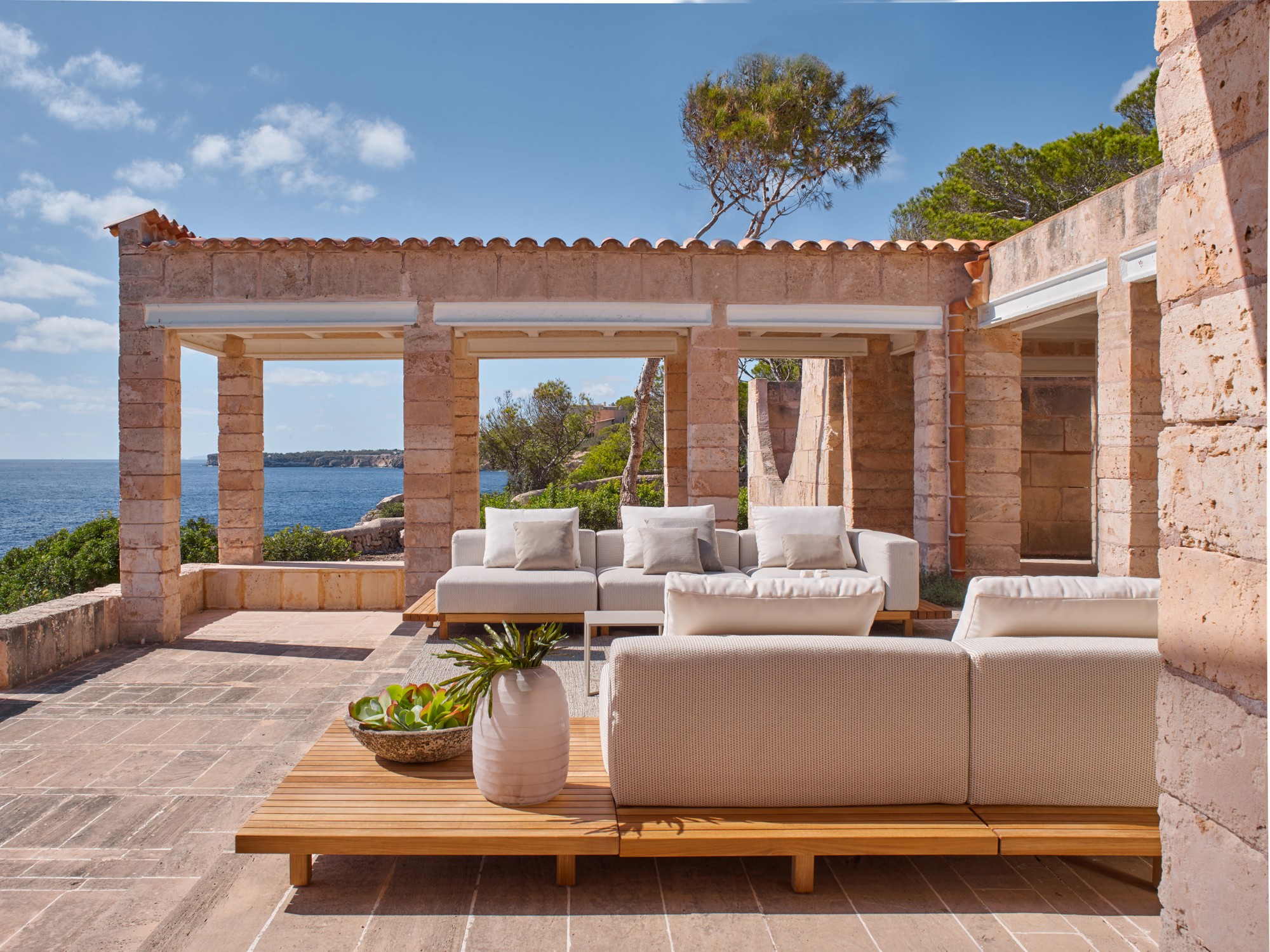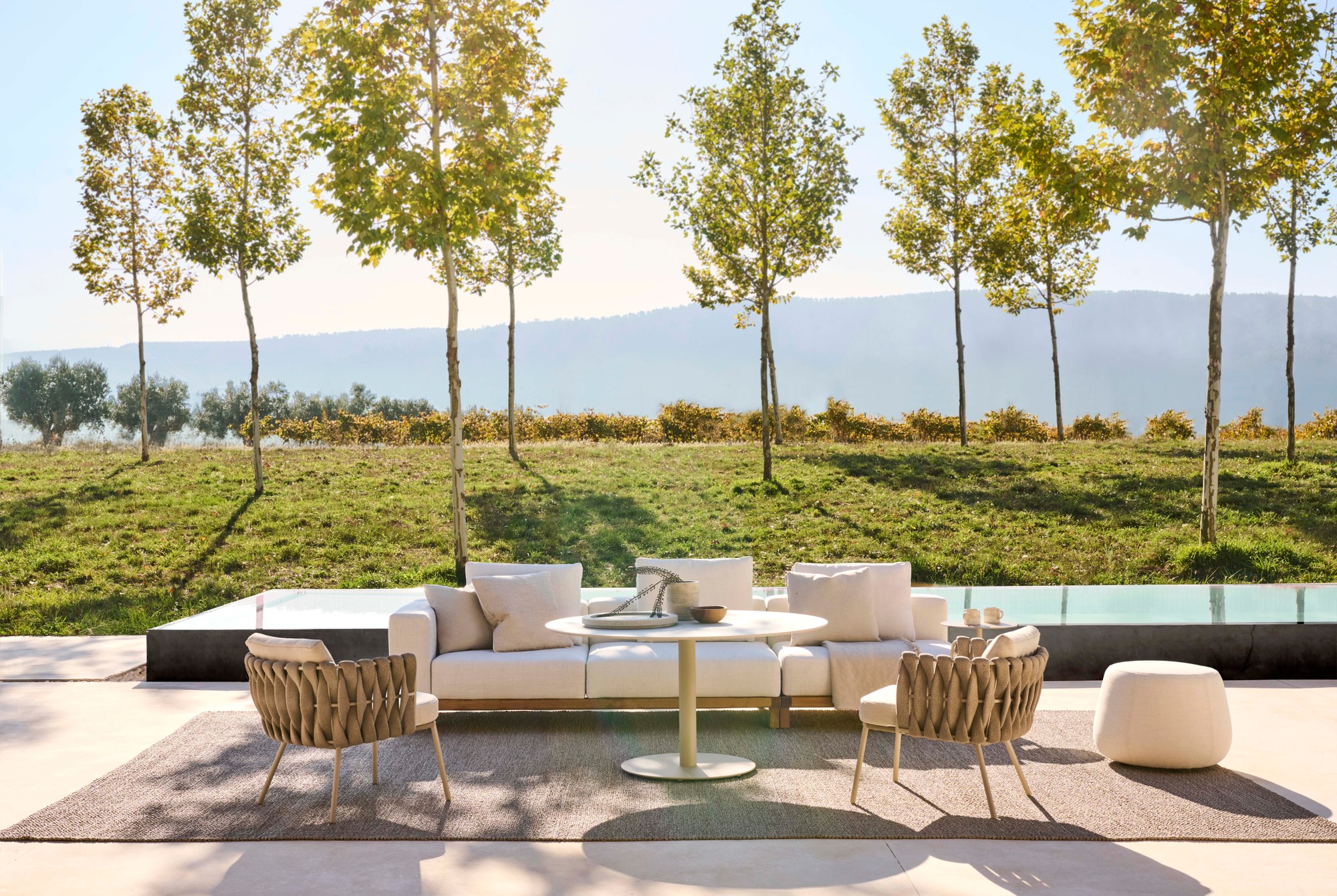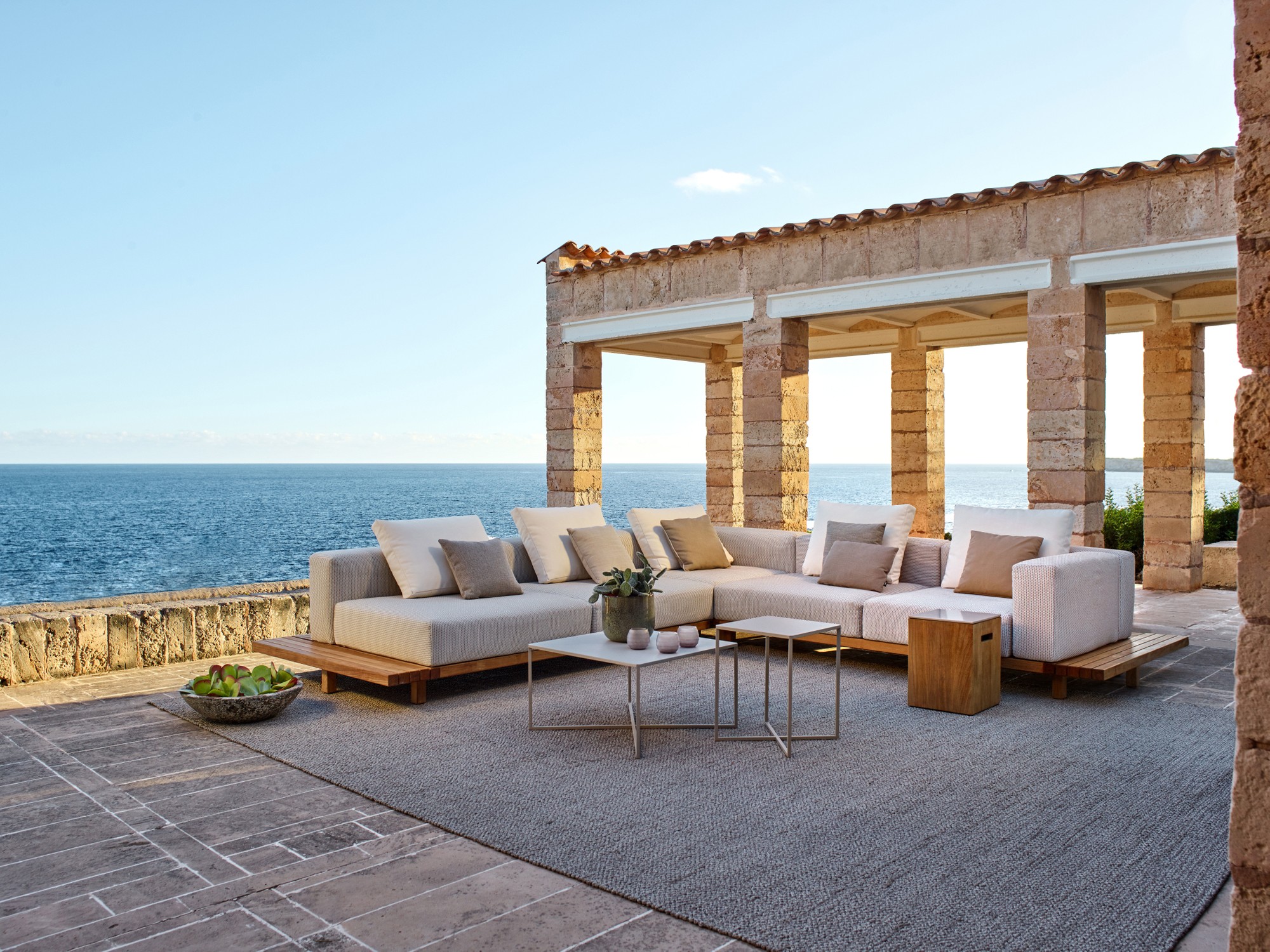 The Vis à vis sofa is an outdoor lounge sofa that brings an ode to pure design. Slender, teak platforms that seem to float, support comfortable outdoor cushions without any visible back or arm structure. The cushions are supported by brackets in stainless steel which means that the sofa looks great from whichever way you look at it. Addionally, you can attach a graphic border of square slats or practical side tables to the platforms. The Vis à Vis sofa offers a modular system in which endless compositions are possible, from a small meridienne sofa to a large corner sofa with sidetables. Special attention is paid to the outdoor cushions, which can easily withstand a sudden downpour, thanks to the ventilating, water-repellent filling. The seams fo the filling are protected by on extra inside cover and the thread used to stitch the seams swells when wet, further preventing water from entering. As for the colours, you can choose from more than 100 nature-inspired outdoor fabrics.
