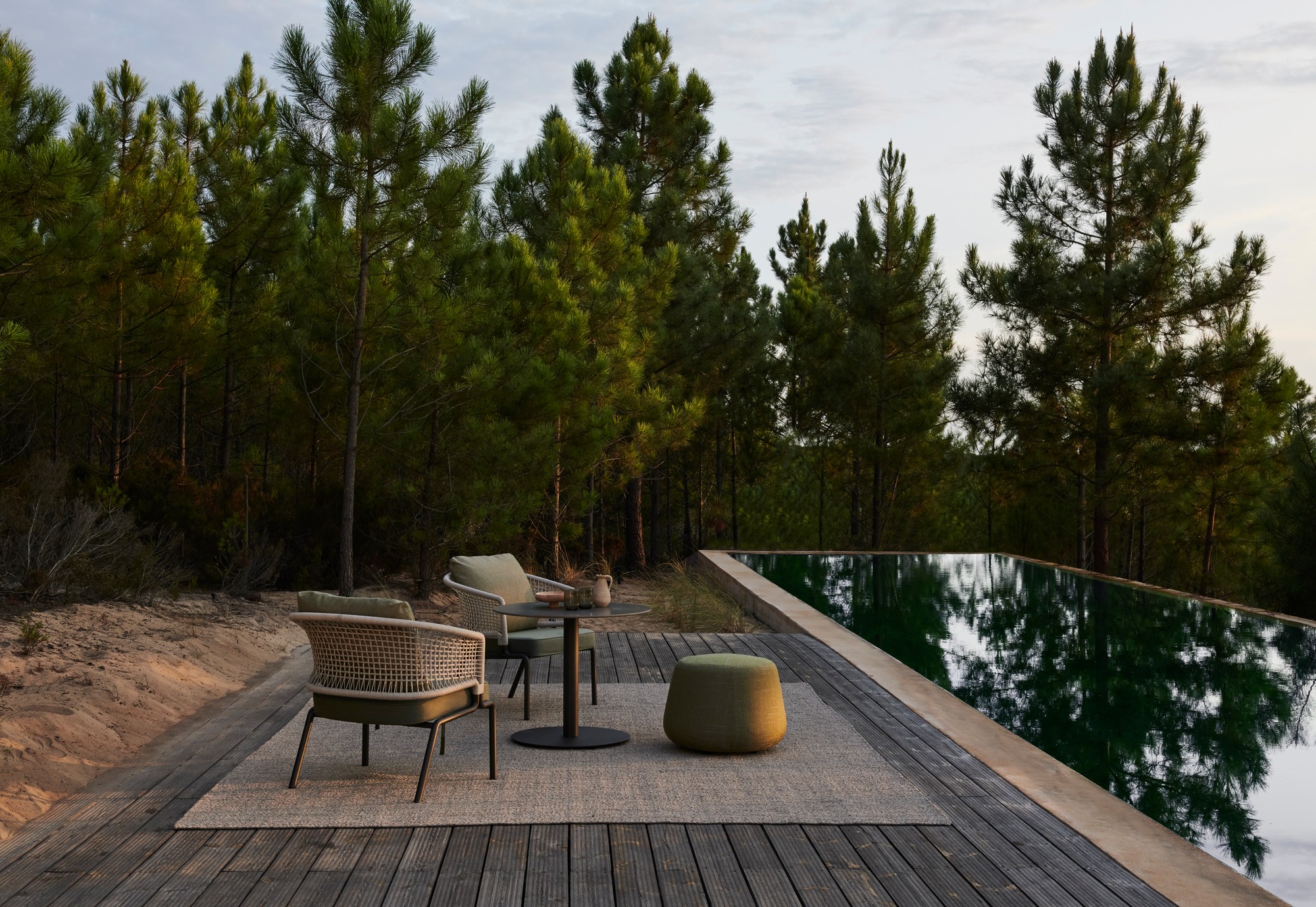 The elegant T-Table with its refined proportions and elegant materials inspires daydreams of a glamorous ‘la dolce vita' existence. The glazed top, made of 400-year old lava stone from the Vesuvius, mirrors the sky and is reminiscent of rippling water. The coloured glazing is added by hand. Baking at a high temperature creates a subtle craquelure finish, giving each table a unique look and making the stone heat, water, UV and stain-resistant, not to mention easy to maintain. This pure and timeless table is also available as a dining' table and coffee table, making al fresco dining even more comfortable.