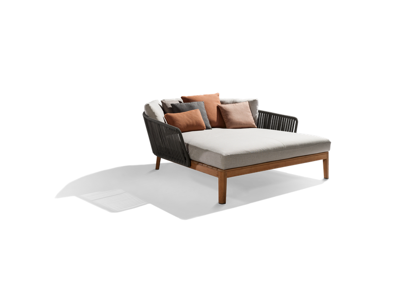 The airy design of the Mood collection and its warm combination of teak and handwoven backs will immediately create an intimate atmosphere on your patio. The rounded design of the durable teak gives the sofa a warm and friendly tone. The weave in Tricord has a very soft touch, but can nevertheless defy all weather conditions. Tribù has developed a range of natural colours that fit in with any type of outdoor environment. The comfortable outdoor cushions can be left out in the rain, thanks to the ventilating, water-repellent filling. The back cushions are available in various styles to match every taste.