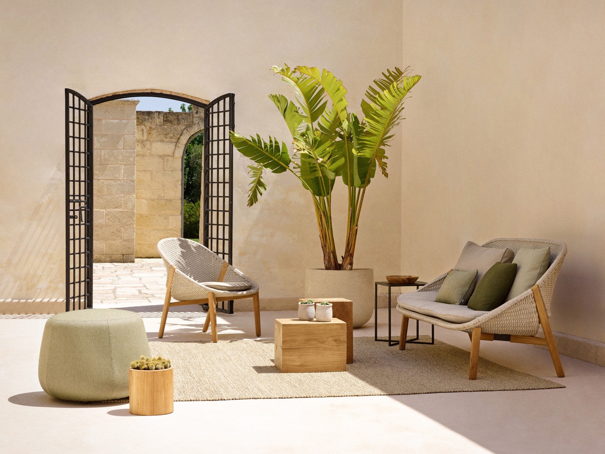 Elio, referring to the Greek sun god Helios and designed by Canadian design firm Yabu Pushelberg, is inspired by the motion of light as it reflects and refracts on landscapes and objects. Multiple soft shades of yarn are woven into one strand, which mimics the hues of natural light and makes each chair unique. The handwoven seat in weather-resistant Tricord rope, draws inward to create a warm, intimate cocoon effect. The 2-seat sofa is framed by natural teak, which supports the seating shell primarily through the back legs that cross the shell.