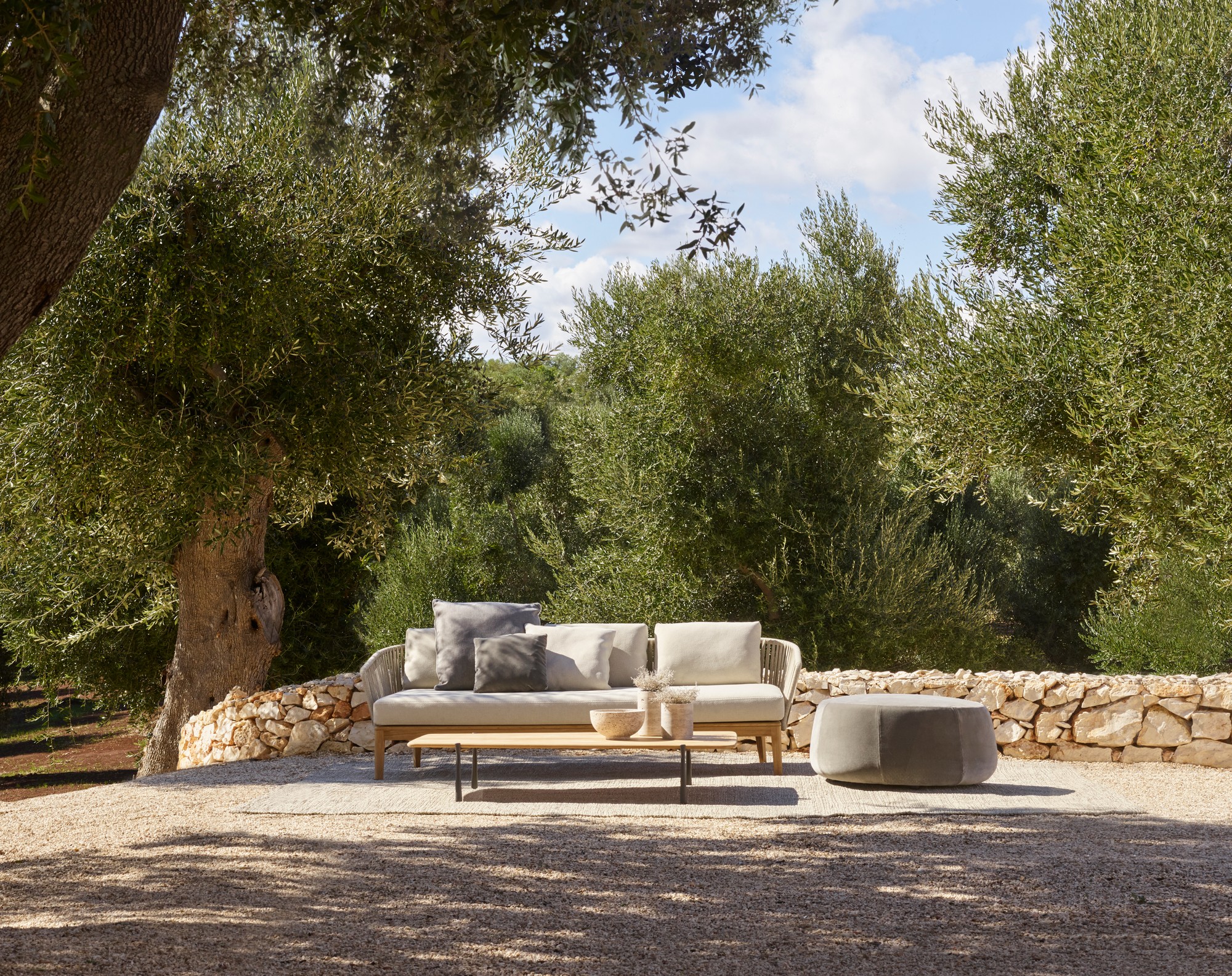 The airy design of the Mood collection and its warm combination of teak and handwoven backs will immediately create an intimate atmosphere on your patio. The rounded design of the durable teak gives the sofa a warm and friendly tone. The weave in Tricord has a very soft touch, but can nevertheless defy all weather conditions. Tribù has developed a range of natural colours that fit in with any type of outdoor environment. The comfortable outdoor cushions can be left out in the rain, thanks to the ventilating, water-repellent filling. The back cushions are available in various styles to match every taste.