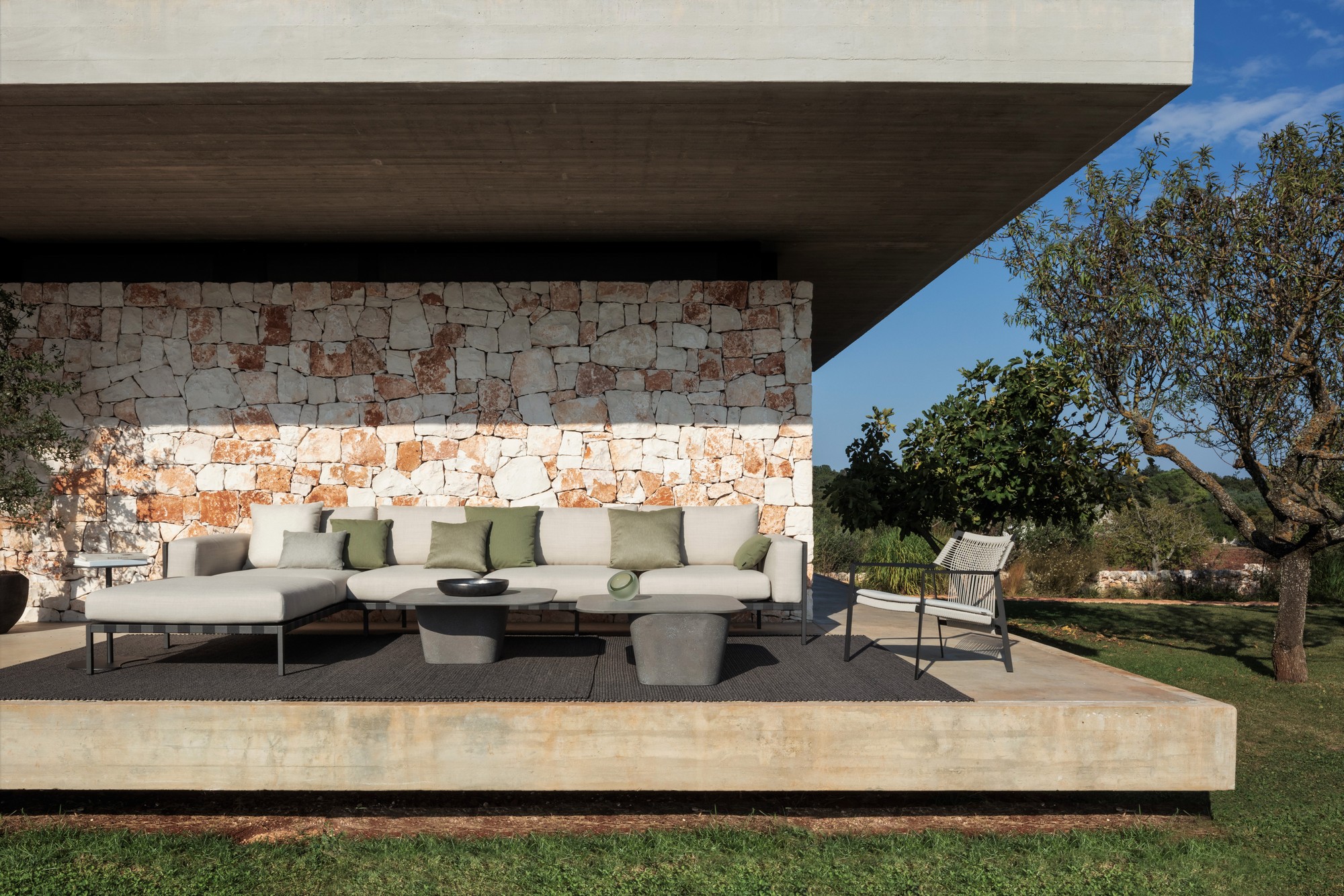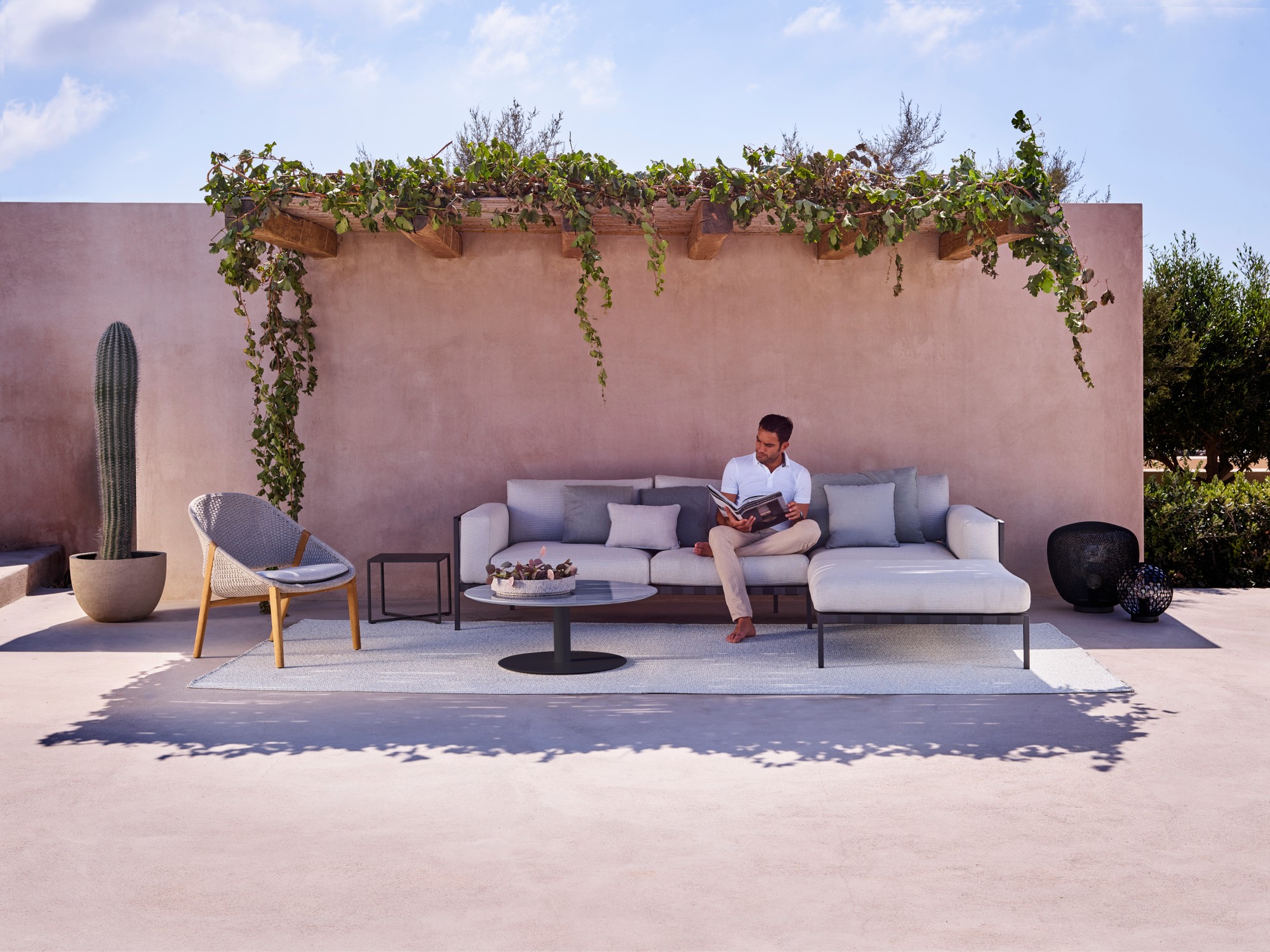 A subtle frame with curved armrests contrasts beautifully with the volume of the cushions, supported by a weave of wide textile straps. Timeless and elegant, the Natal Alu is an outdoor sofa that looks great on any patio. With nineteen different modules, two different seat depths, two available frame colours and more than 100 fabrics to choose from, the possibilities are endless. The aluminium frame is powder coated with ultra-durable, UV- and scratch resistant textured lacquer which provides a beautiful matte look. Special attention has been paid to the outdoor cushions, which have a ventilating, water-repellent filling, so they can easily handle a sudden downpour. The seams have an extra inside cover and the thread used to stitch the seams, swells when wet to further prevent water from penetrating.