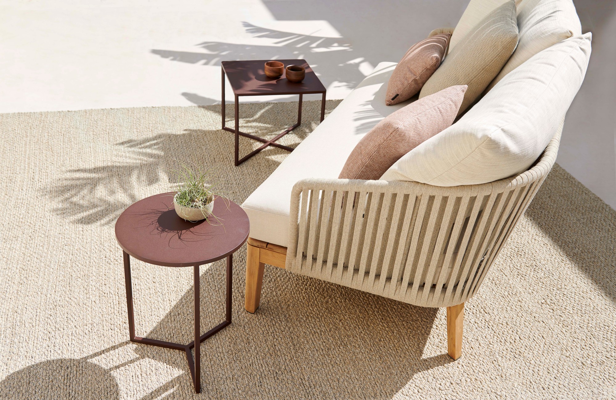 The Natal Alu X side tables in matte powder coated aluminium combine functionality with a subtle, contemporary design. The fine lines of the crossed frame and the edged angles are eye-catching touches, typical of Tribù's attention to detail. These multi-purpose side tables are available in different shapes and heights and in various nature-inspired colours, meaning the Natal Alu X will complement any outdoor setting.