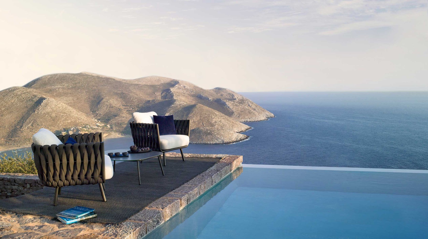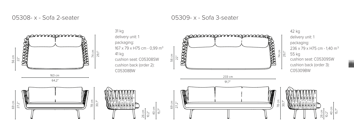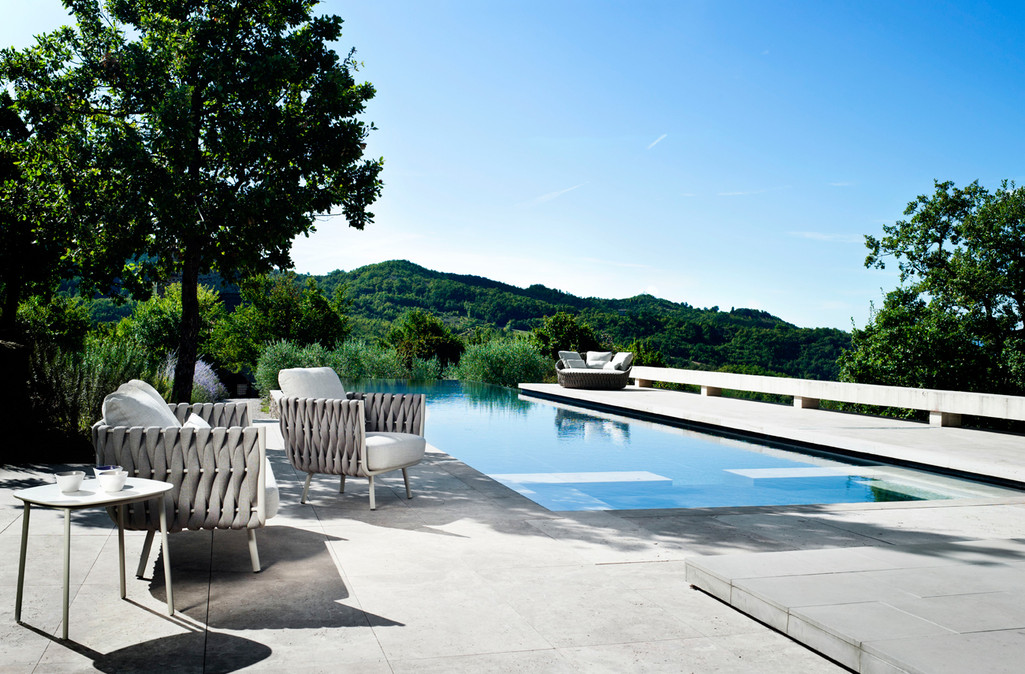 The Tosca outdoor collection is simultaneously warm and inviting, stylish and intriguing. It was the first time Tribù called upon a female designer to draw an outdoor furniture piece with a more feminine touch. Monica Armani succeeded in her challenge: rounded forms, tapered legs and an elegant seating shell in powdercoated stainless steel, upholstered with extra-wide braiding. The material for the braiding is genuinely innovative : foam mousse is encased in a seamless sheath of knitted textilene and polyolefine which makes the material weather-resistant, but also surprisingly soft to the touch. The seating comfort is especially pleasant, also thanks to the comfortable outdoor cushions.