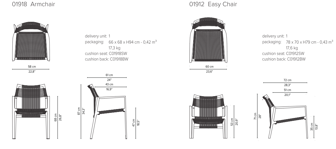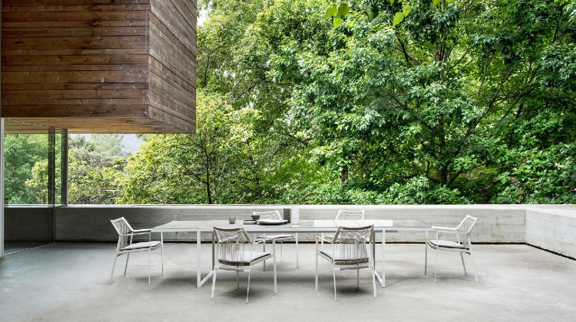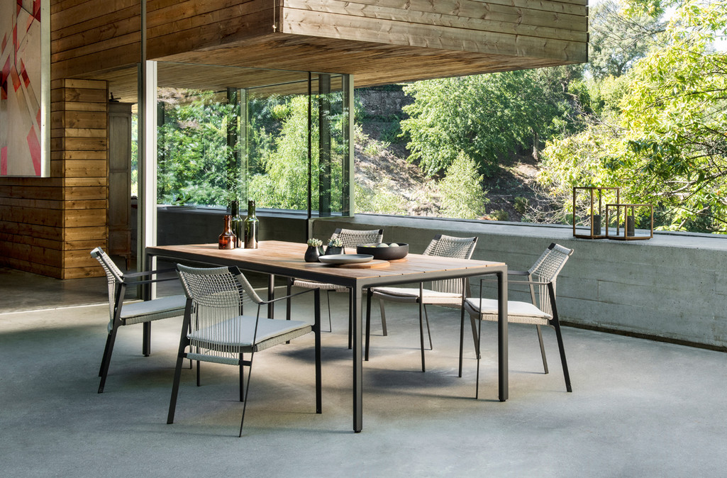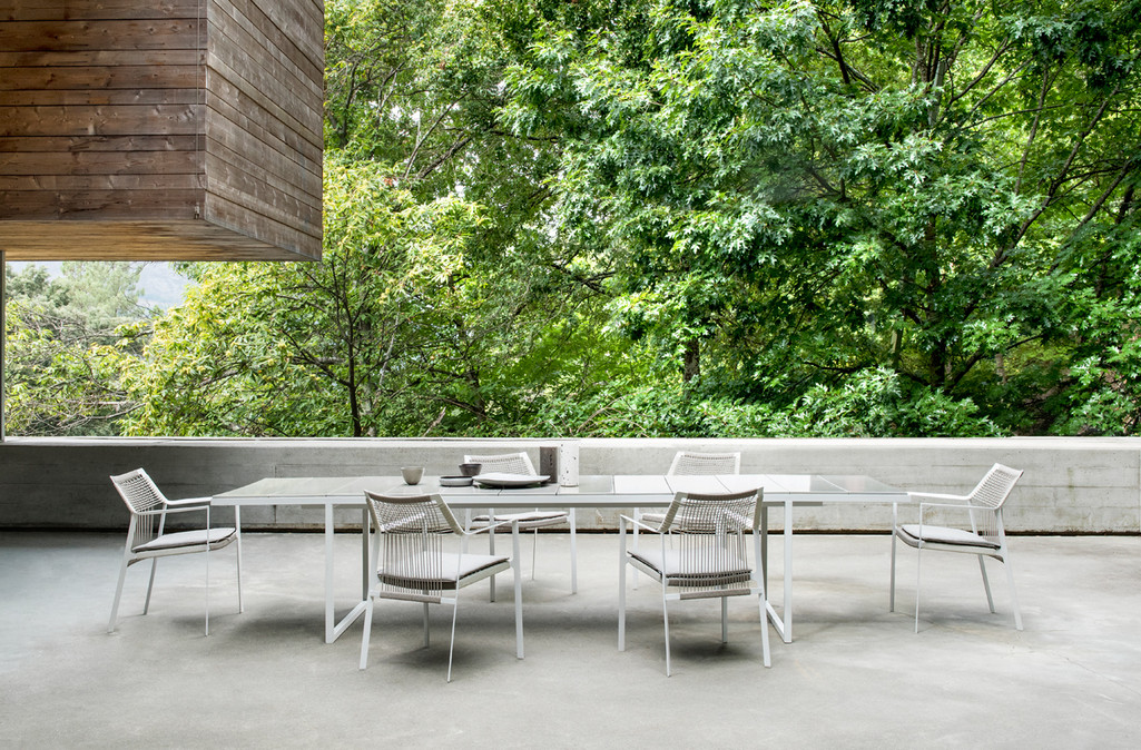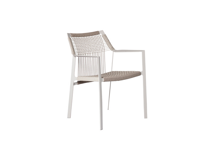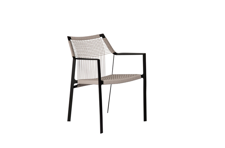 Light and airy, Nodi's silhouette is characterised by twisted-interlaced rope in weather-resistant Canax?, stretched across a precise geometric wireframe. Refined proportions and a minimalist approach to materiality lend a casual lightness to the collection. The slim profile of the arm is angled slightly inward in a welcoming gesture. The open weave in Canax?, a combination of PVC and natural hemp, crosses in vertical and horizontal lines, providing shape and structure to the seat and back. Strong and durable, the rope work is also gently forgiving, adding to the ease and comfort of each chair.