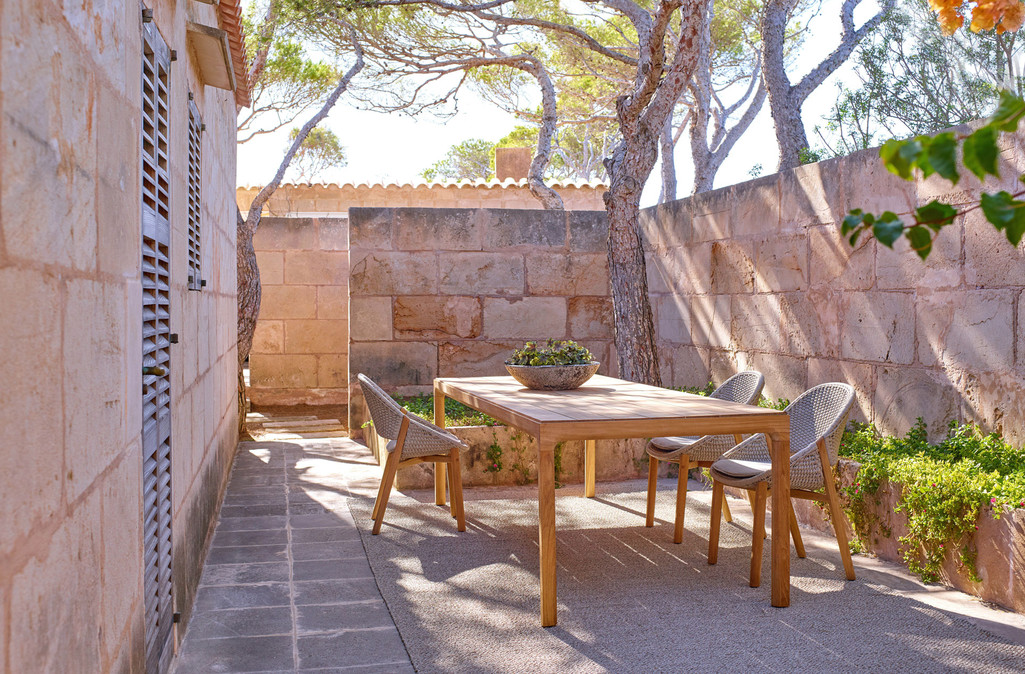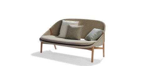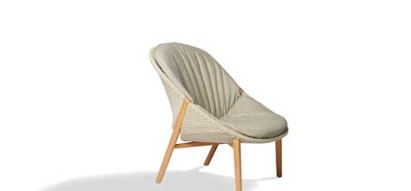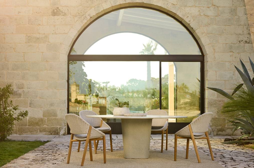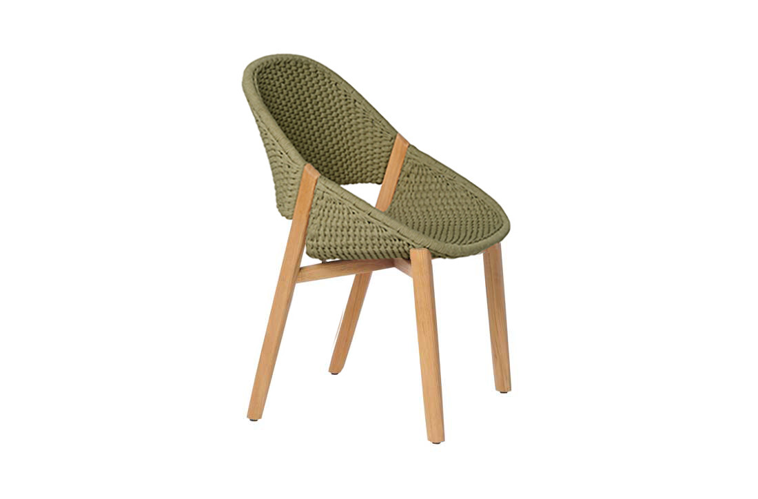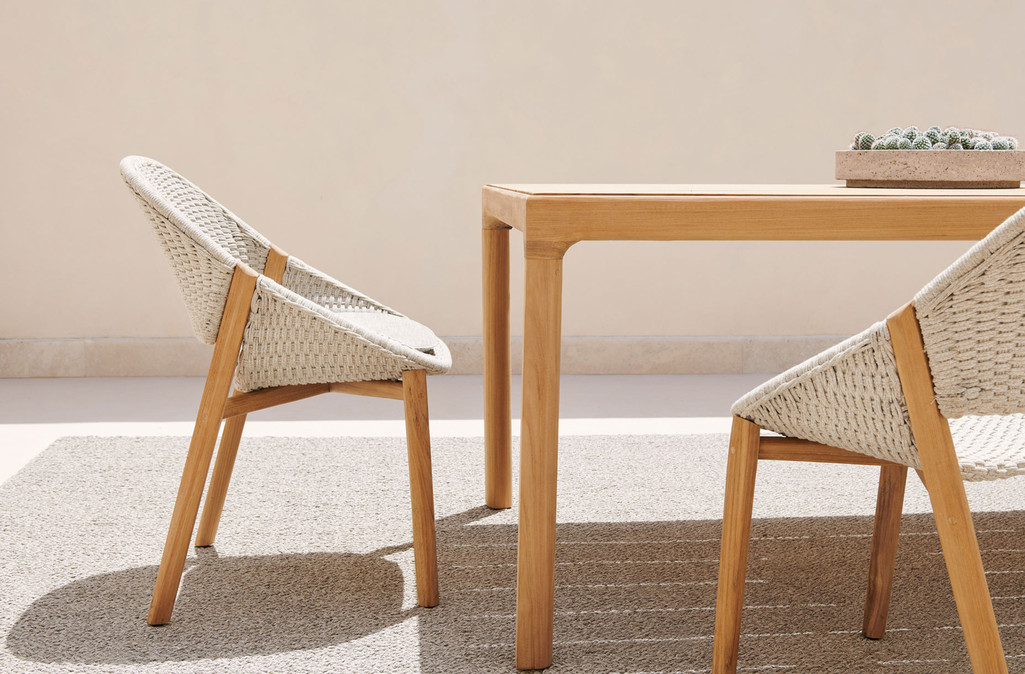 Elio, referring to the Greek sun god Helios and designed by Canadian design firm Yabu Pushelberg, is inspired by the motion of light as it reflects and refracts on landscapes and objects. Multiple soft shades of yarn are woven into one strand, which mimics the hues of natural light and makes each chair unique. The handwoven seat in weather-resistant Tricord rope, draws inward to create a warm, intimate cocoon effect. The chair, perfect for relaxed dining, is framed by natural teak, which supports the seating shell primarily through the back legs that cross the shell.