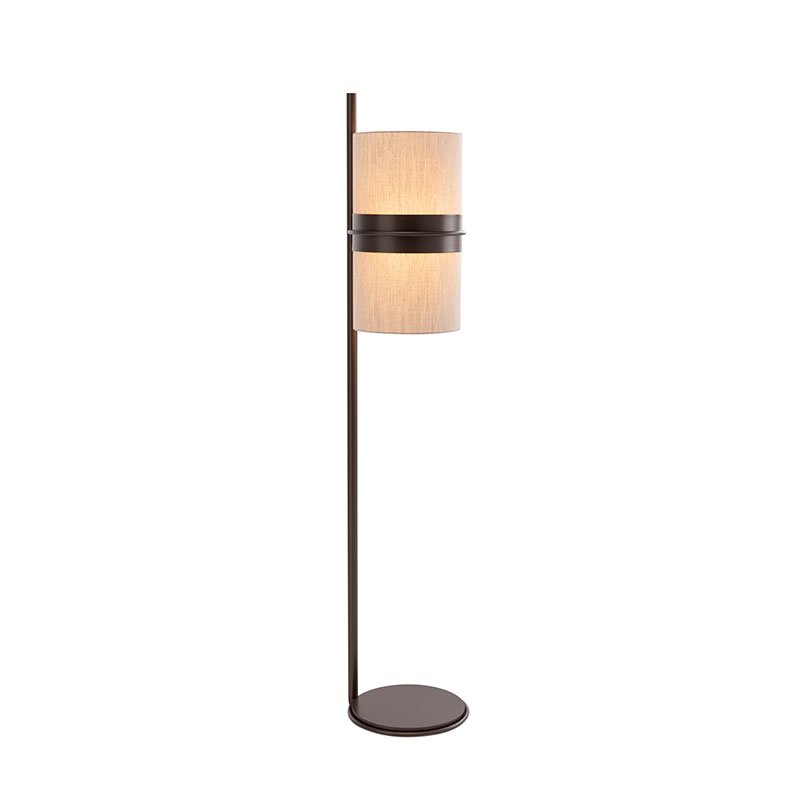 Minimalist design for the Tiubet collection of lighting. The steel band with Silk varnish bronze colour finishing supports and encircles the lampshade, then reconnects to the structure, lending the lamp a bold ‘’suspended’’ effect. The fabric is natural linen.