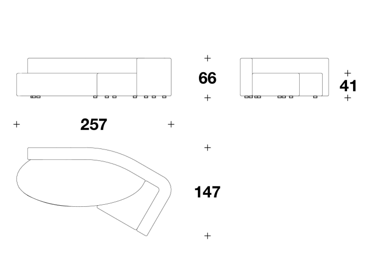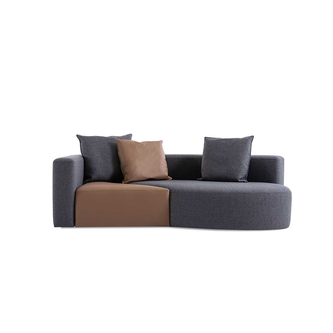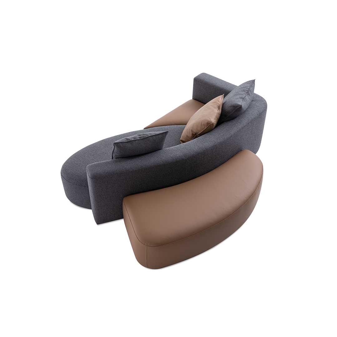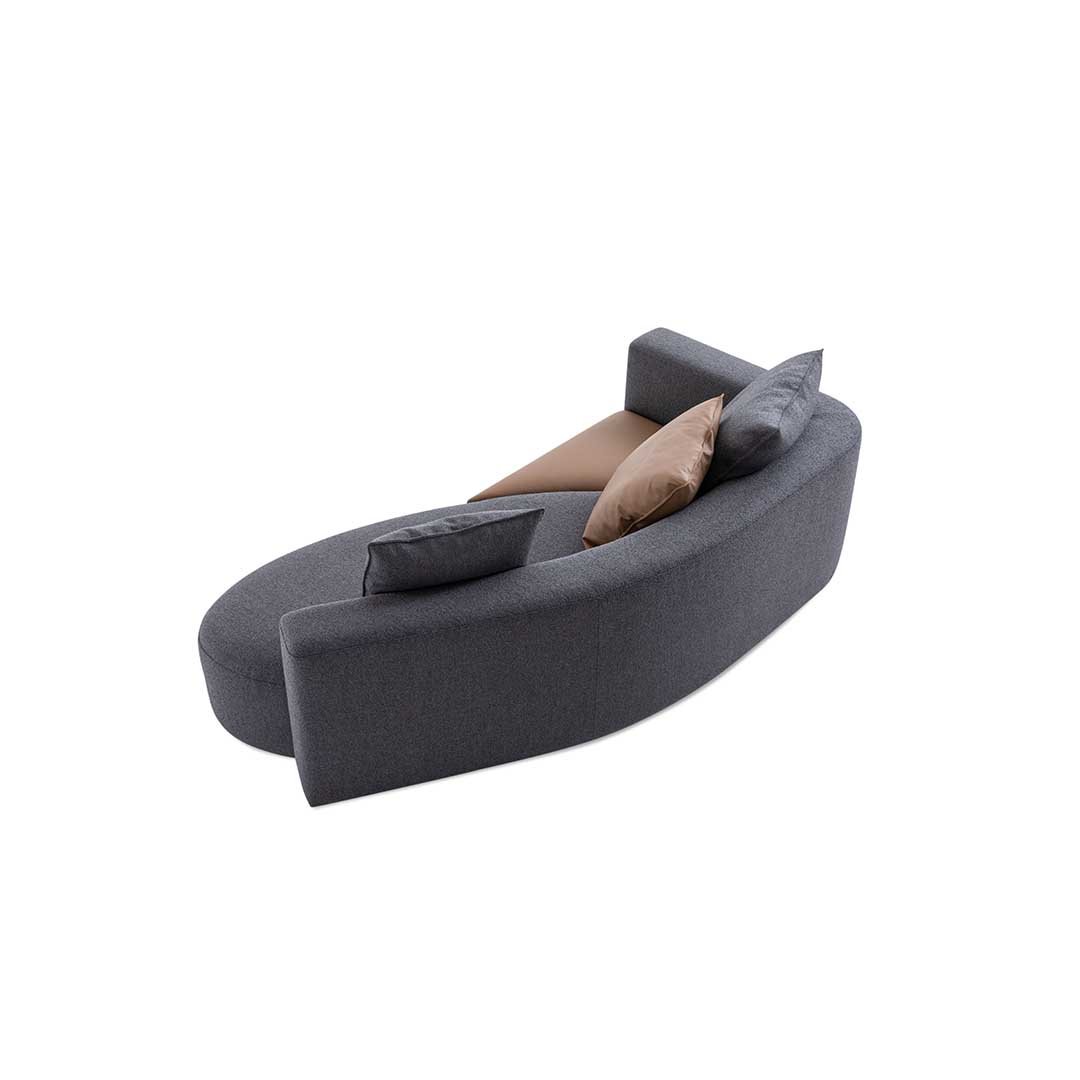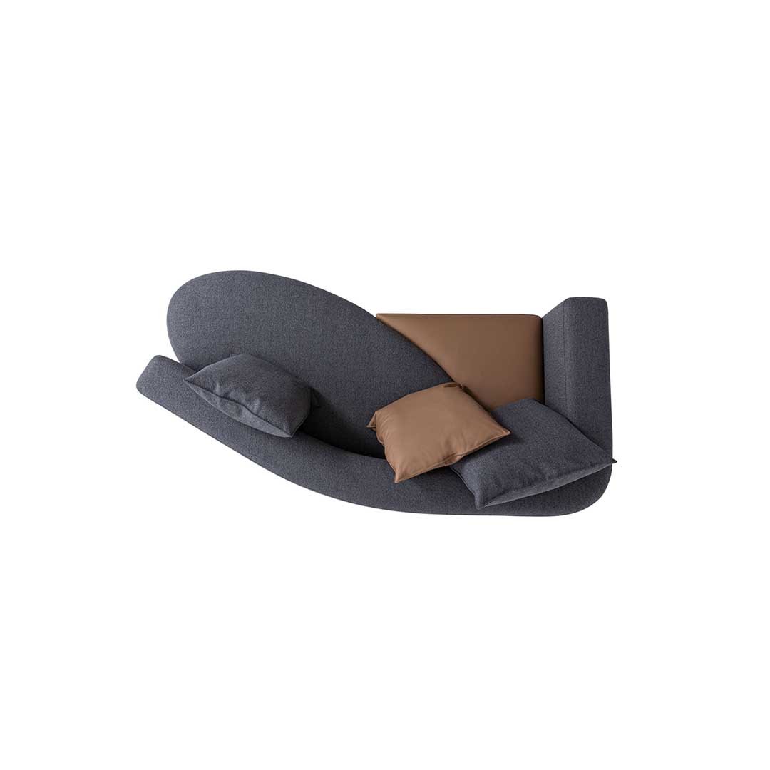 A meeting of silhouettes gives rise to a family of asymmetrical and sculptural sofas that play around with shapes and colours in extreme aesthetic purity. Wooden frame, cover in fabric or leather with removable back cushions.