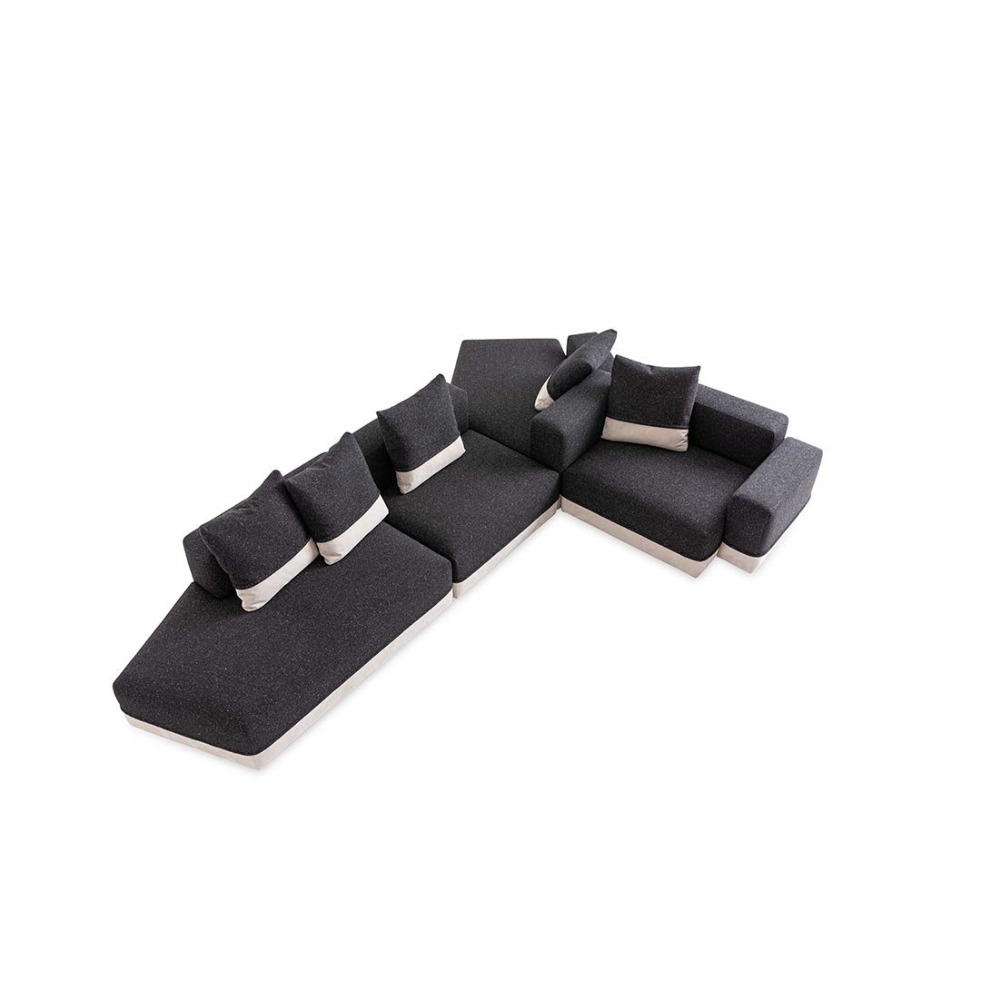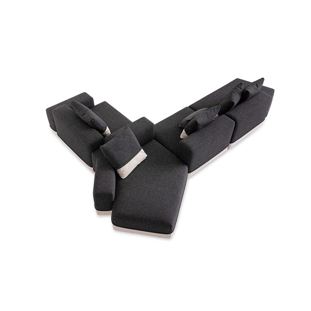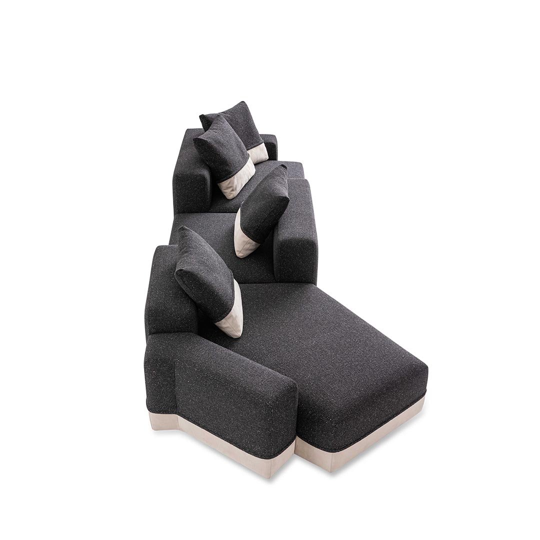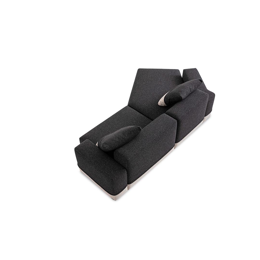 Designed by Carlo Colombo, the modular sofa Godwin is the symbol of the collection: its irregular shapes and segmented lines intersect to define space. Well-proportioned and flexible shapes that recall the concept of nature coupled with large, soft paddings outline an all-new modular approach.