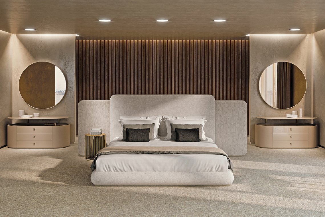 In the bedroom area of the Roma collection, the bed plays a fundamental role, made with a wing structure, completely covered in fabric or leather, both in the headboard and in the bed frame. The side wings can be made with embroidery, in the characteristic texture of the collection. The Roma bed is available in different finishes as per sample card.