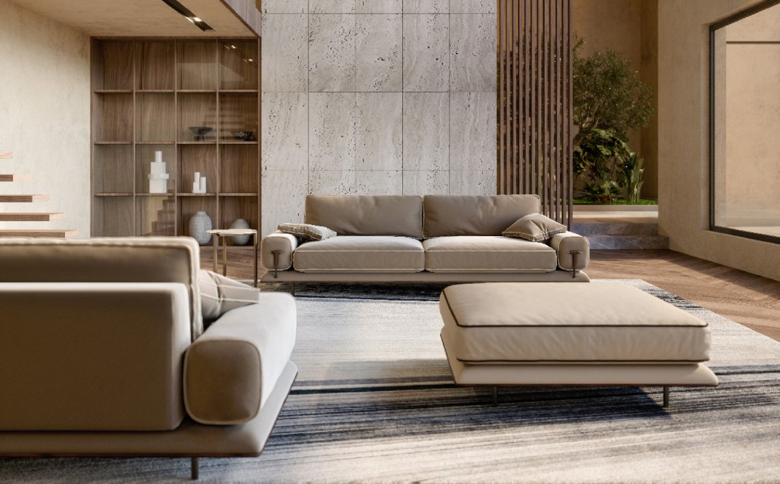 Blues modular sofa, thanks to an ample choice of modules, starting from the central ones up to the end pieces and the chaise longue, including the corner units and the poufs, the modular compositions are several and satisfy most requirements. Even as a 2 or 3-seater, the Blues sofa is outstanding for its minimalist design and at the same time for the richness of its details : the walnut wood base, linear and uniform is supported by tubular metal legs. The Blues sofa is available in different finishes as per sample book.