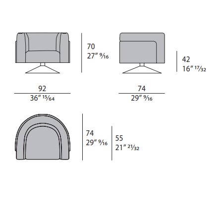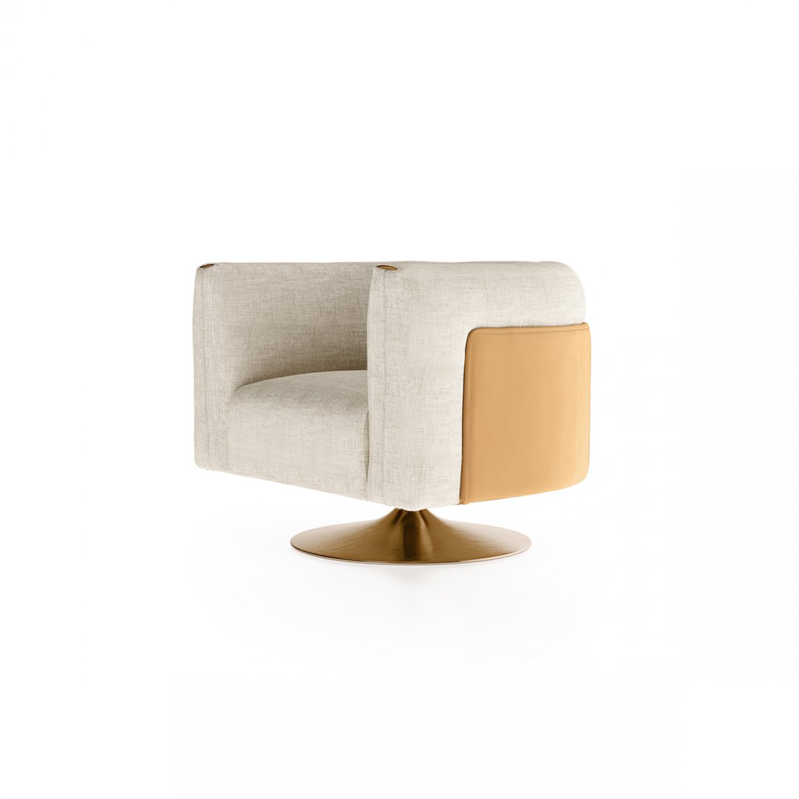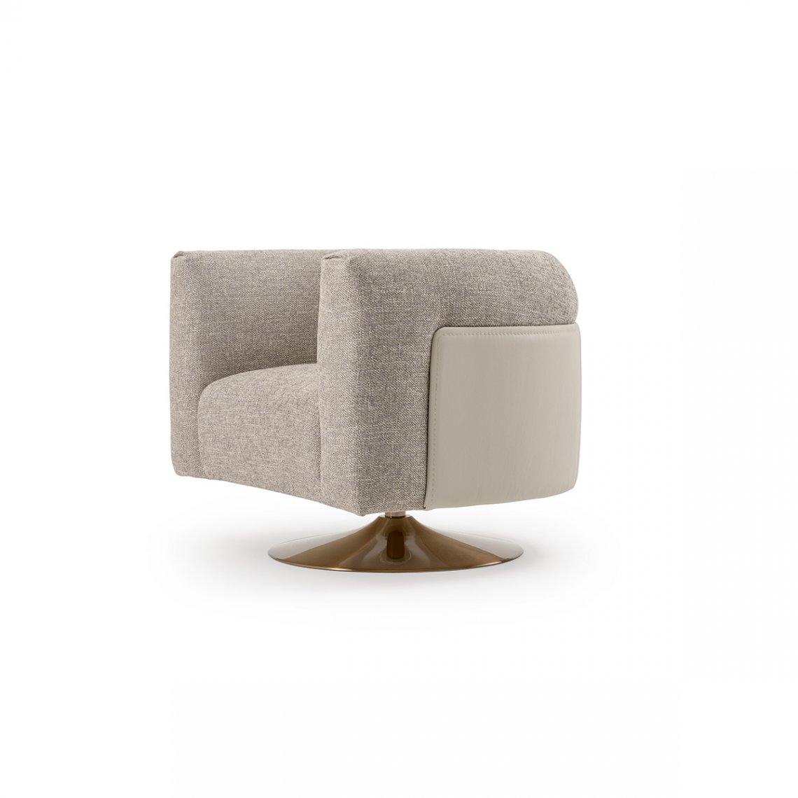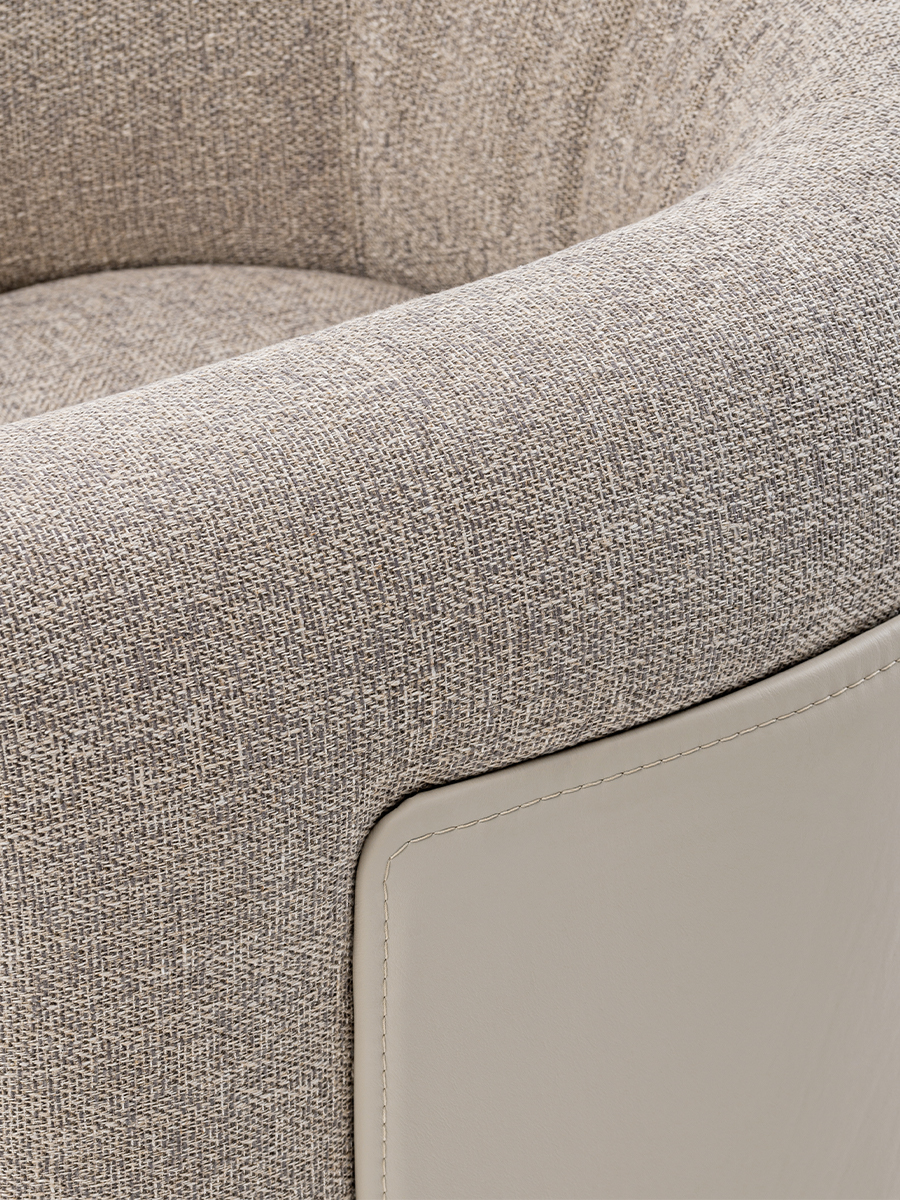 The armchair of the Soul collection takes up the design of the sofa, with the panel on the back that embraces the seat and the inserts on the armrests. The metal base of the armchair is available in the fixed or swivel version. The leather or fabric upholstery can be used in combination to create elegant contrasts. The Soul armchair is available in different finishes as per our samples book.