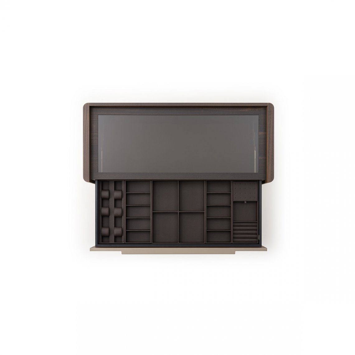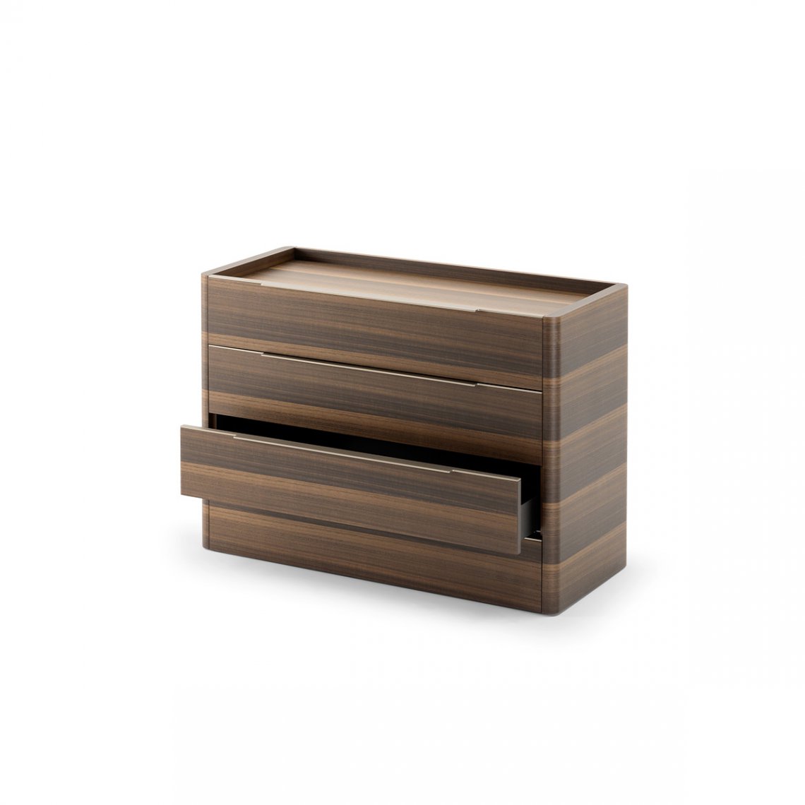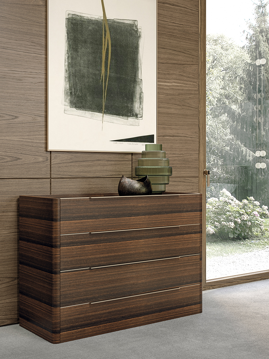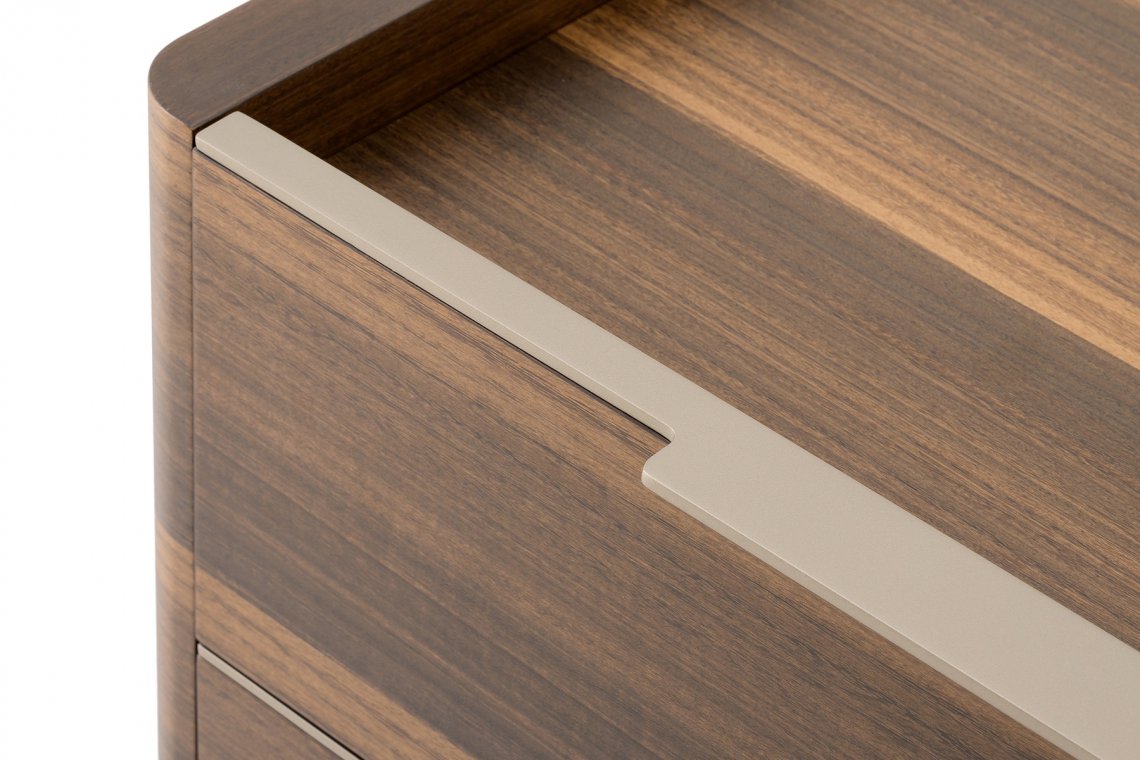 The ches of drawers of Domus collection has shapes made elegant by the sides with curved corners and by the long handle with curved metal silhouette. The structure, the top and the drawers are in Eucalyptus, while the details and the handles in Matt Light Platinum metal. The Domus chest of drawers is available in different finishes as per sample card.