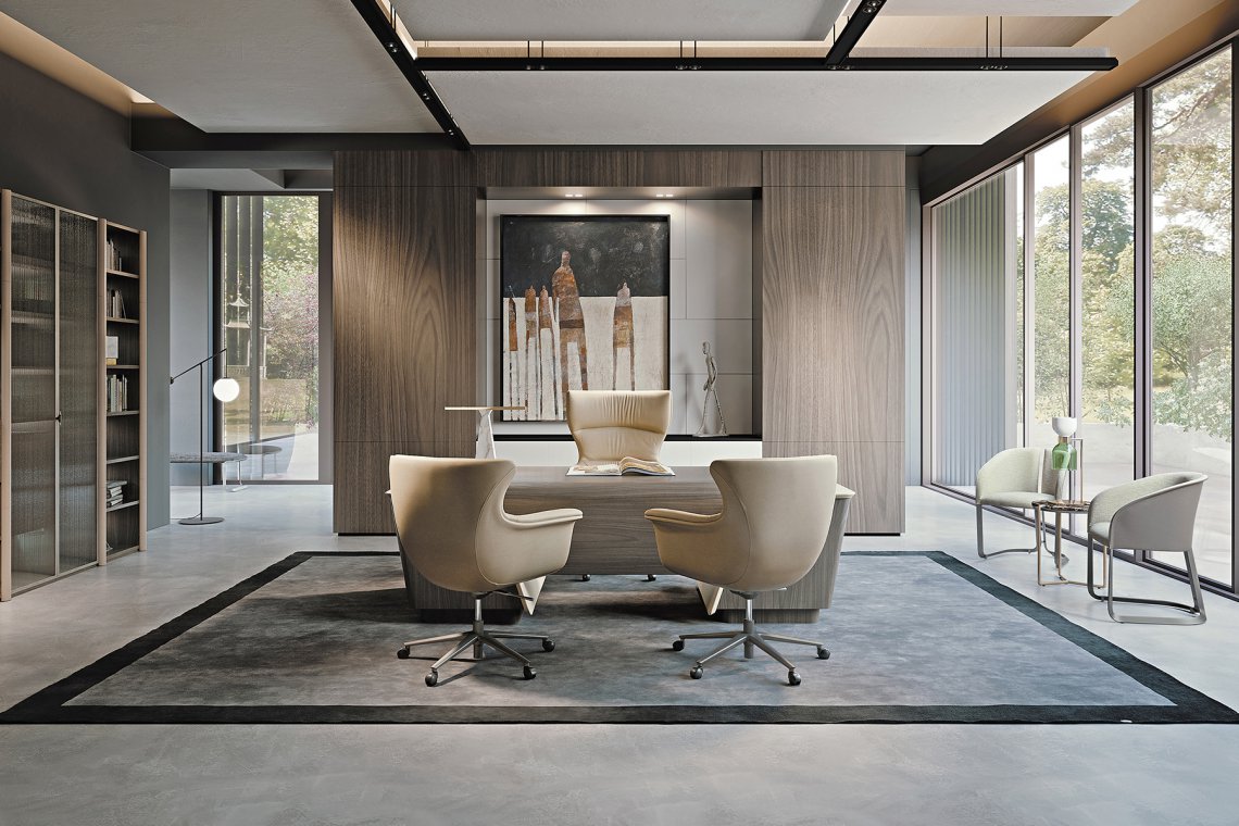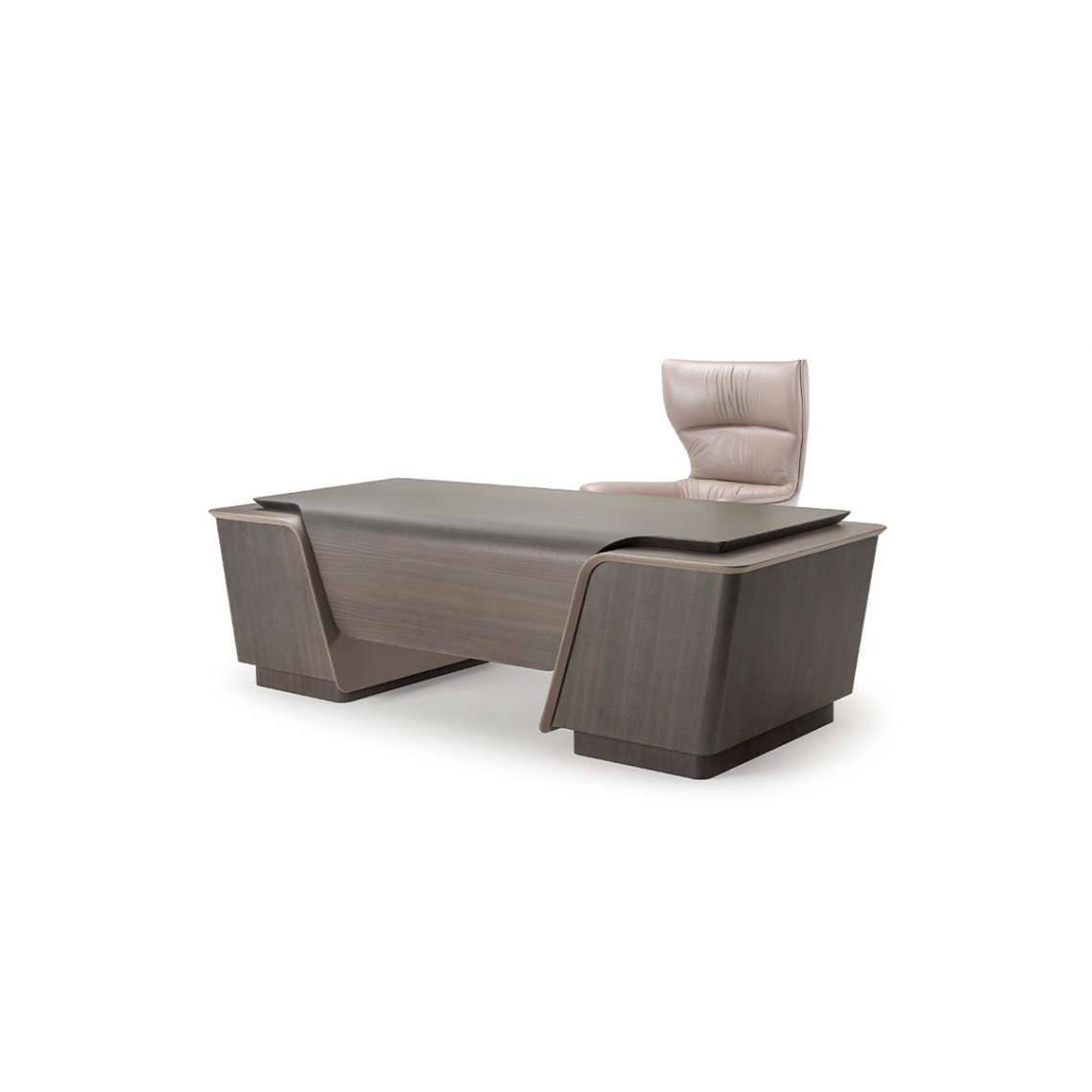 The Blues desk has an important structure and an original formal aspect. The processing of leather and walnut wood is the real protagonist. The legs of the desk are equipped with drawers covered in leather. The Blues presidential desk is available in different finishes as per sample card.
