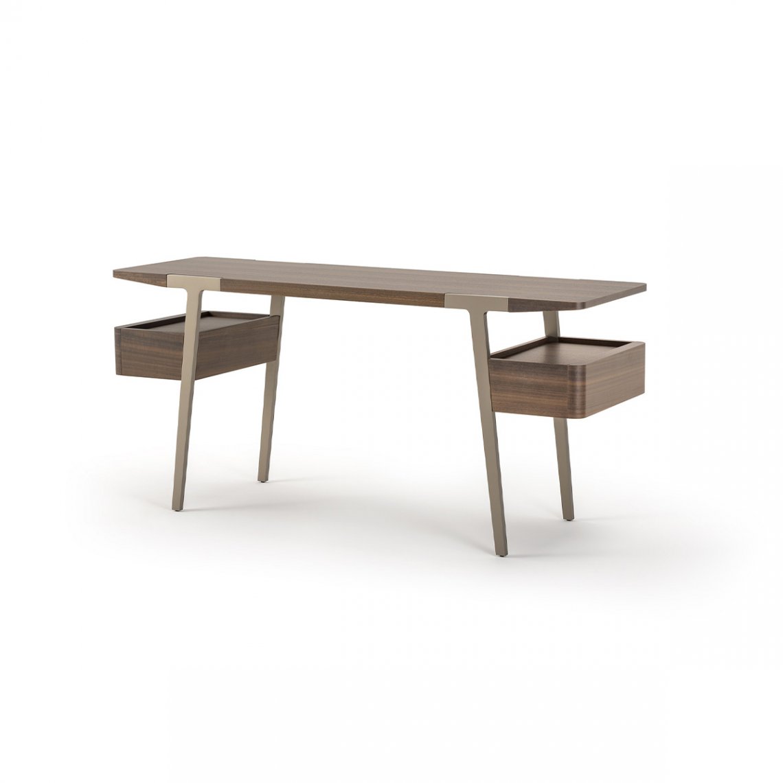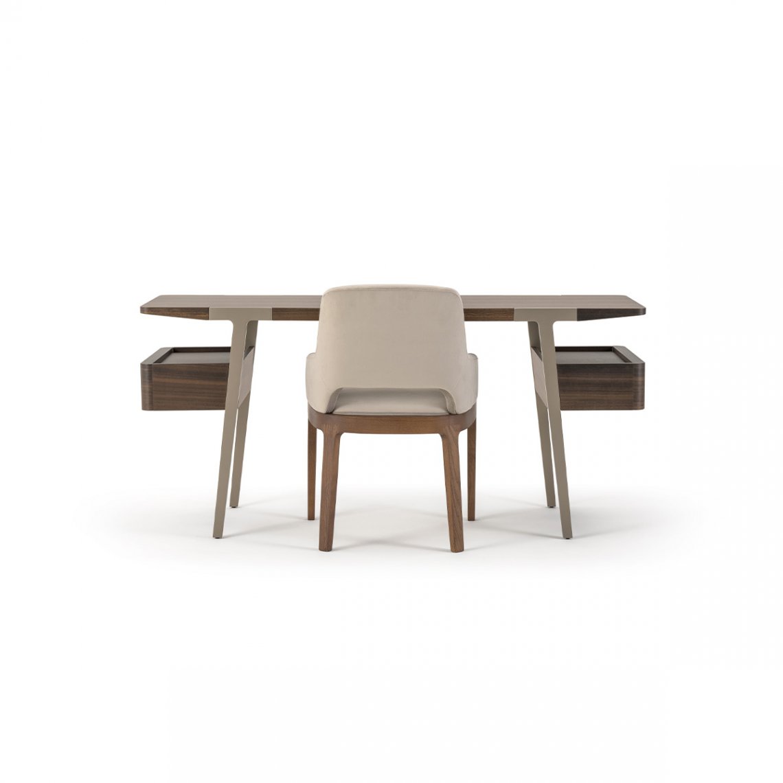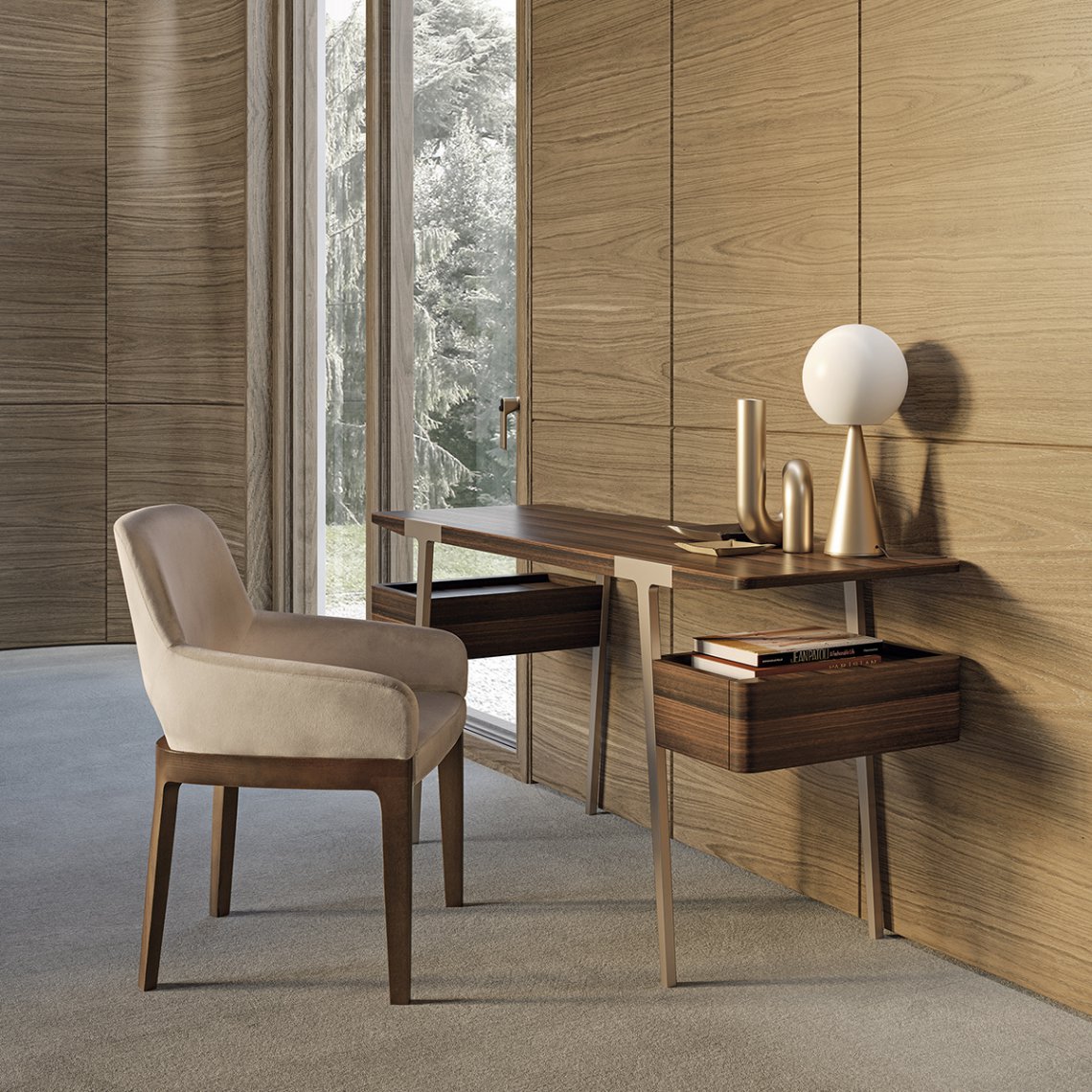 The bedroom area is completed by the Domus dressing table, a versatile and functional piece of furniture thanks to the top and two side drawers in Eucalyptus. The legs are made of Matt Light Platinum metal. The Domus dressing table is available in different finishes as per sample card.