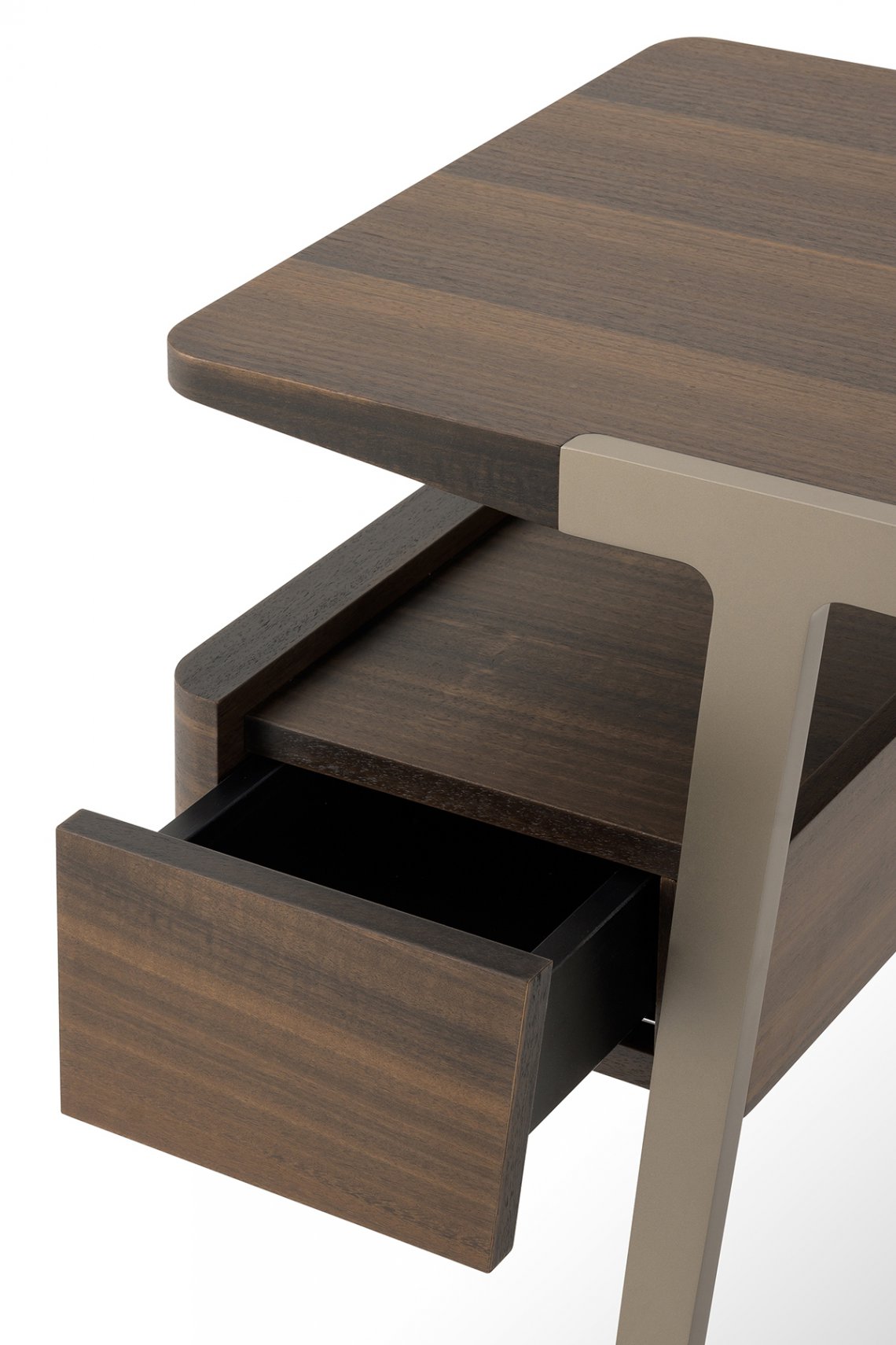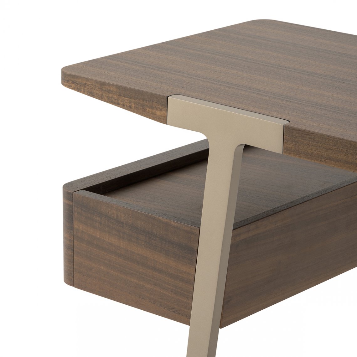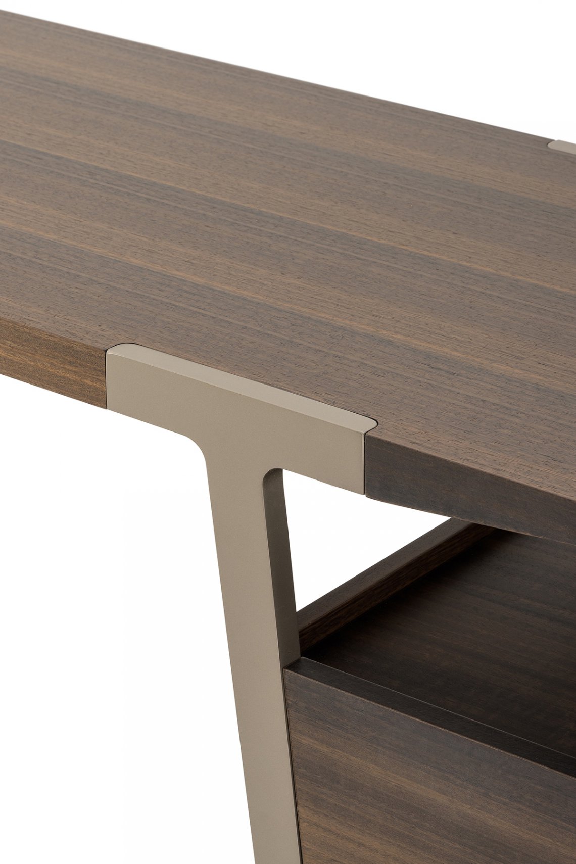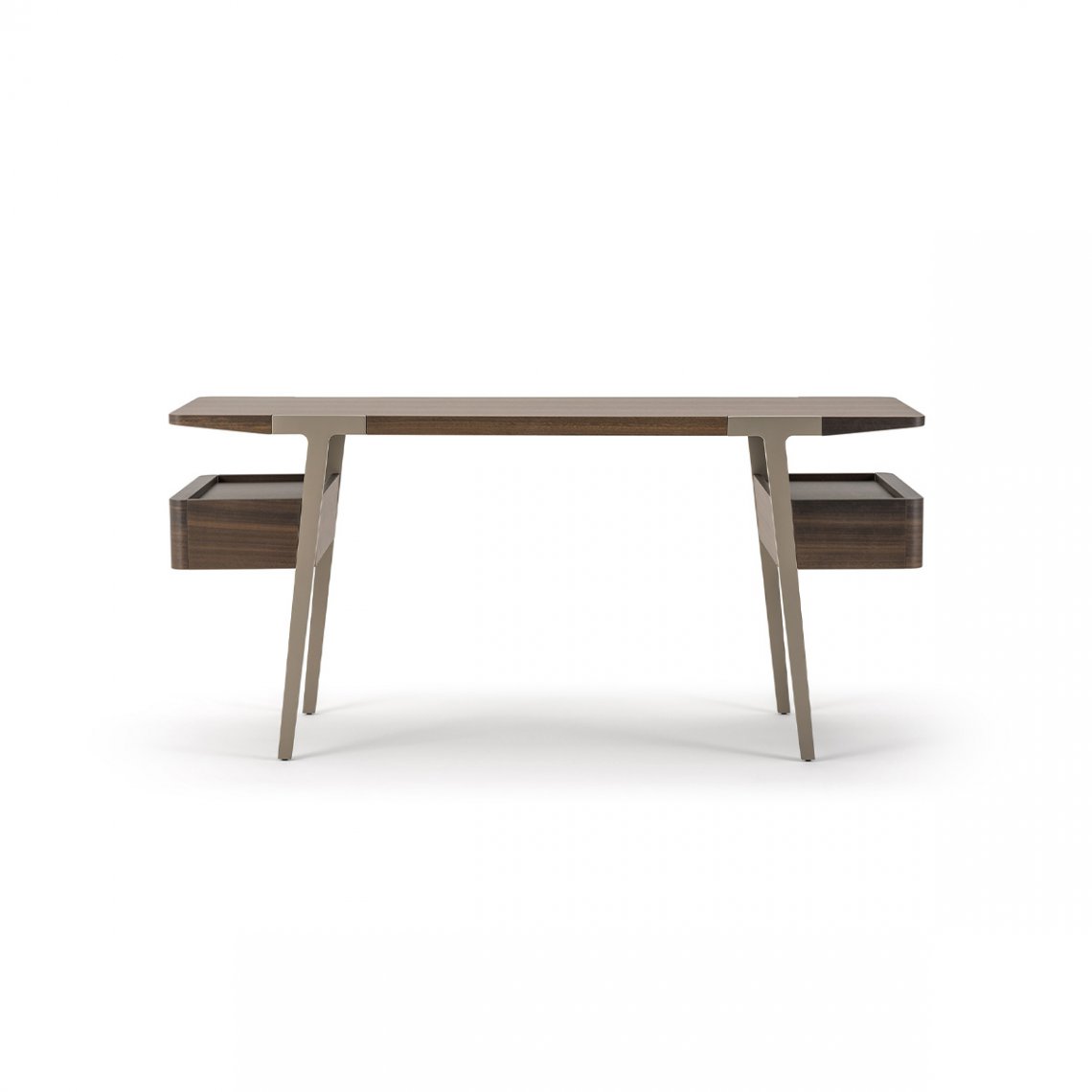 The bedroom area is completed by the Domus dressing table, a versatile and functional piece of furniture thanks to the top and two side drawers in Eucalyptus. The legs are made of Matt Light Platinum metal. The Domus dressing table is available in different finishes as per sample card.