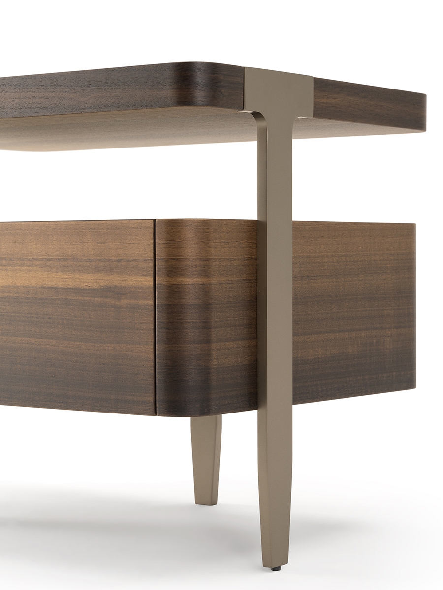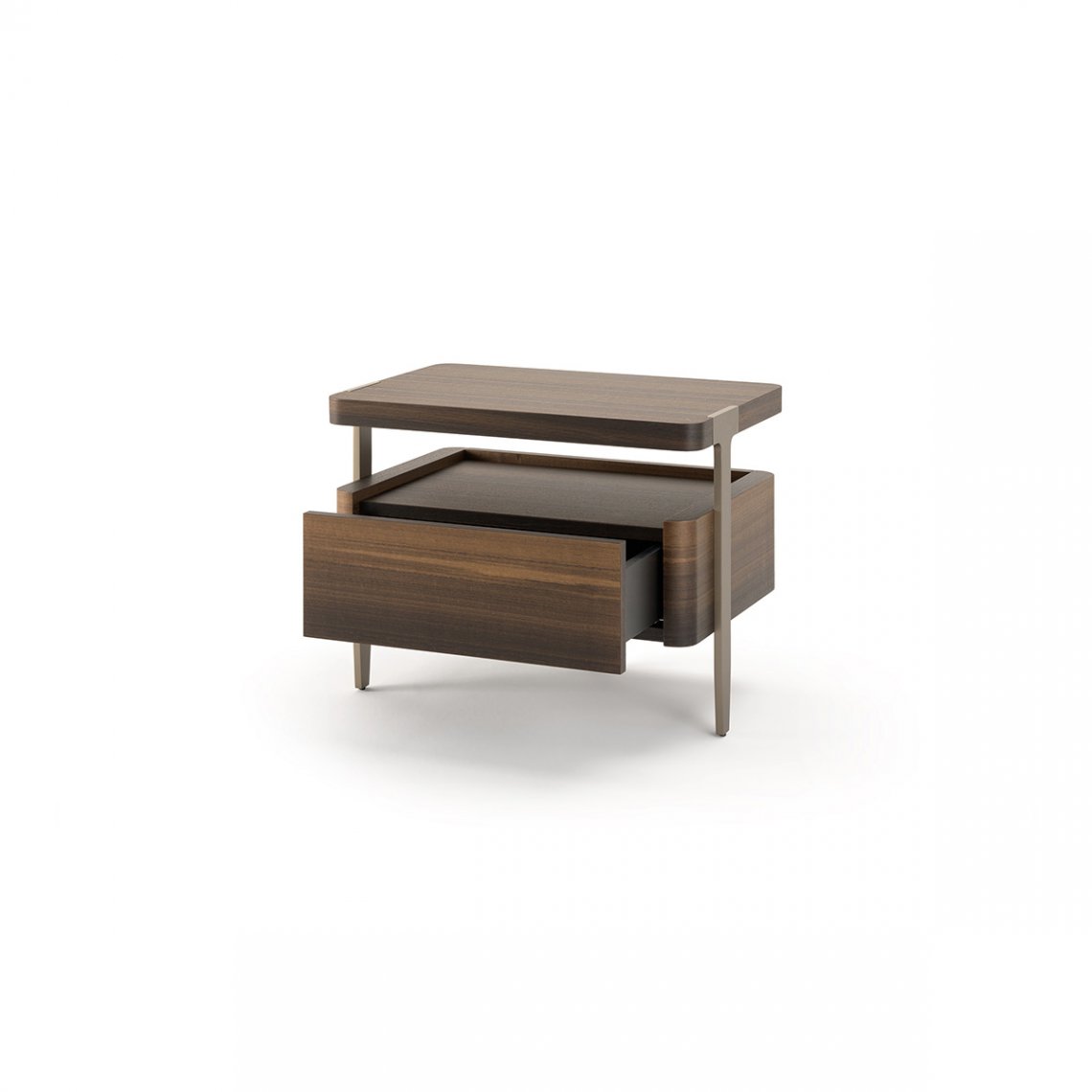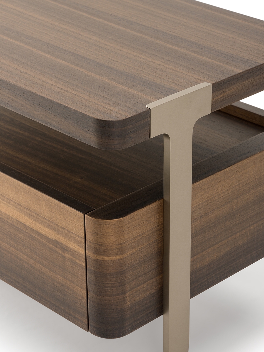 The Domus bedside table is in perfect balance between contemporaneity, the search for uniqueness and functionality. The Eucalyptus wood structure is supported by Matt Light Platinum metal legs. The Domus bedside table is available in different finishes as per sample card.