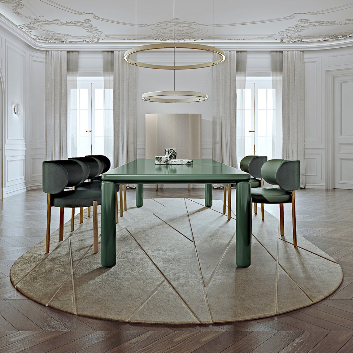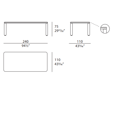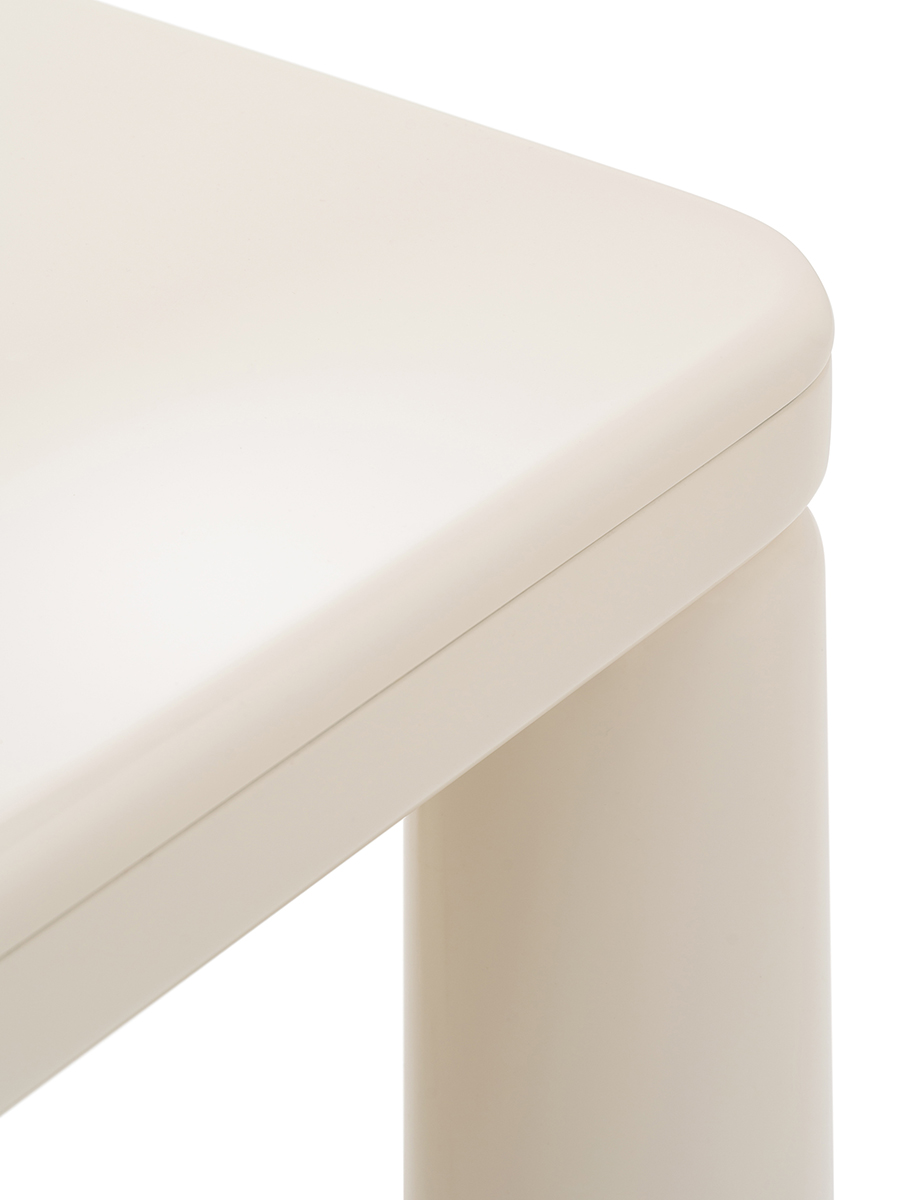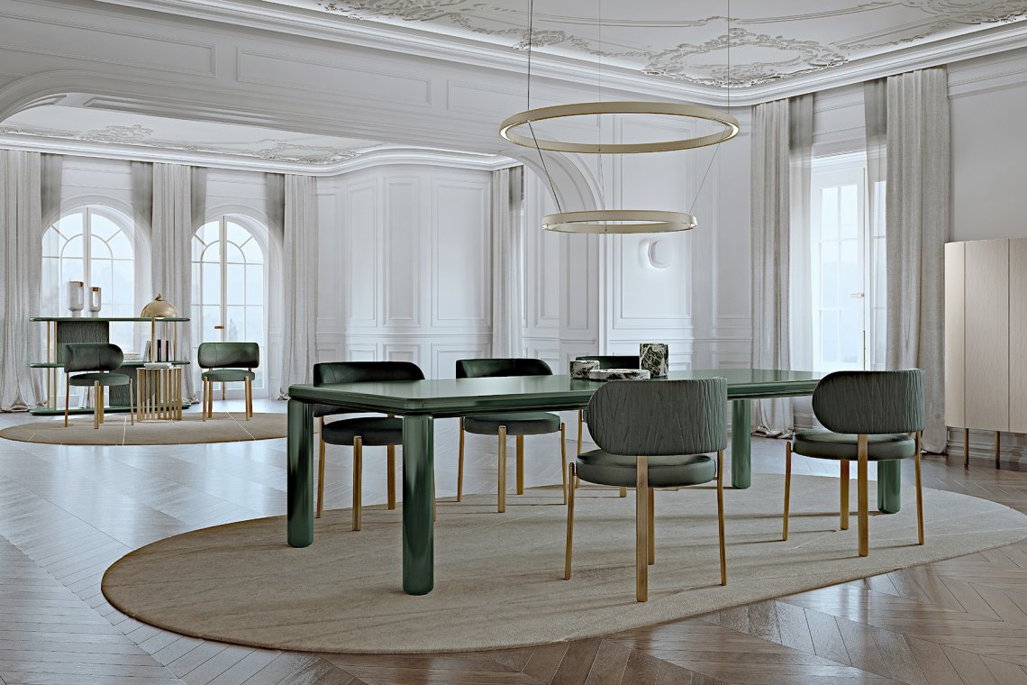 The Roma table, rectangular but with a rounded design, has a top with rounded corners and cylindrical legs, and is made entirely of single-color lacquered wood. The Roma table is available in different finishes as per sample card.