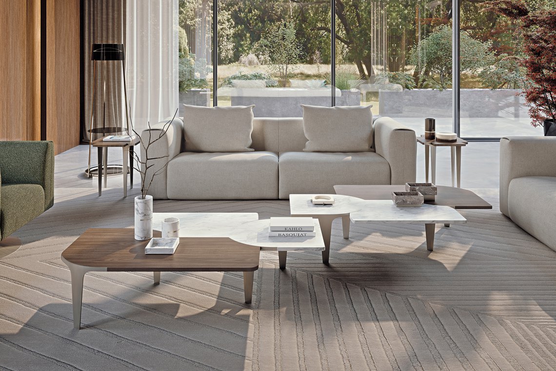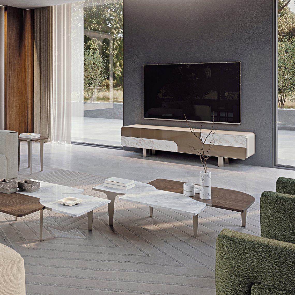 The Soul coffee table has an elegant design, the top is available in walnut wood or with a marble section. The legs and details are in Matt Light Platinum metal. Soulcoffee tables are available in different finishes as per sample card.