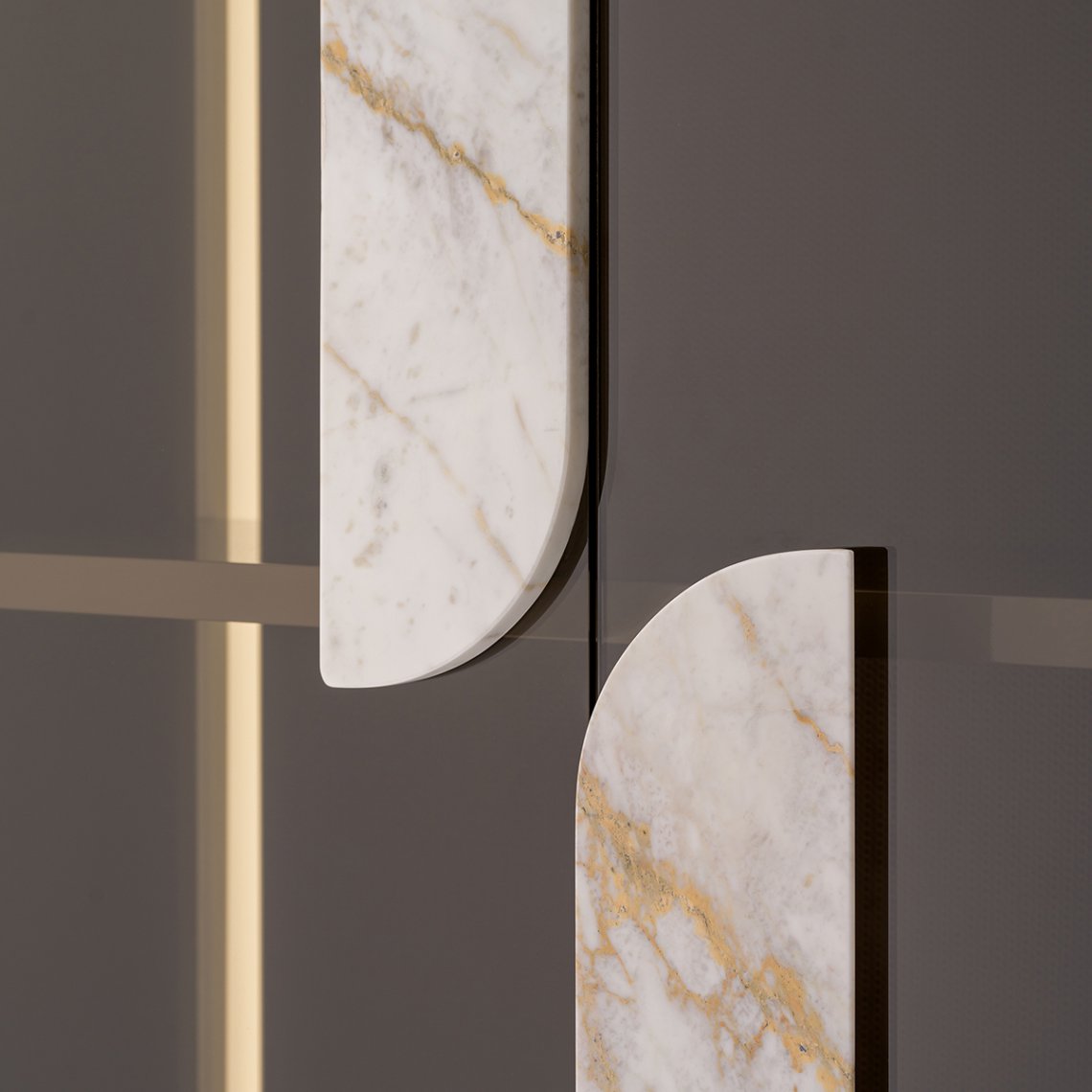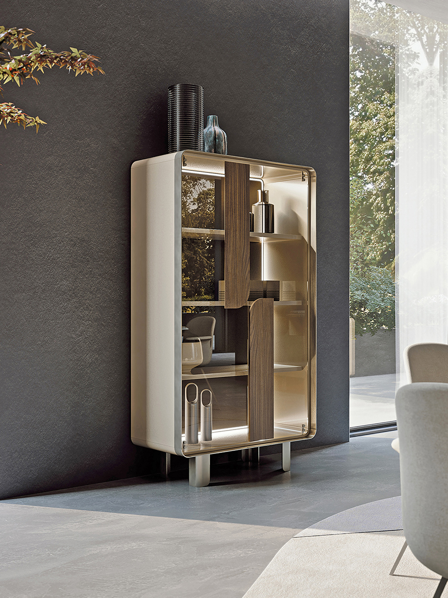The vitrine of the Soul collection incorporates the metal profile and the alternation of full and empty spaces of the sideboard that also find space in the verticality of the cabinet. The linearityof the glass doors is interrupted by the marble inserts emphasizing the coexistence of such different materials, making the new products suitable for being welcomed in design environments with a strong personality. The Soul vitrine is available in different finishes as per sample card.