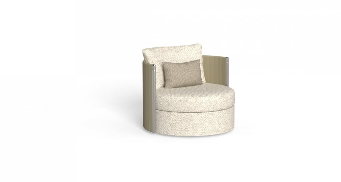 La poltrona living della collezione George è una poltrona girevole che ruota a 360° su se stessa. La forma rotonda e accogliente della seduta è incorniciata dai montanti in acciaio inox e avvolta da un intreccio di cinghie leggermente imbottite, una combinazione che caratterizza tutta la collezione George.