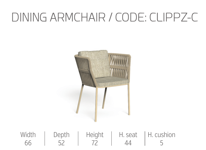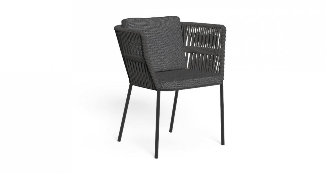 L’intreccio di corde tipico della collezione avvolge la seduta creando una seggiola che ben completa la collezione Cliff. L’intreccio colpisce per la sua elegante complessità che sottolinea la preziosità di qualunque outdoor nel quale la seggiola venga collocata.