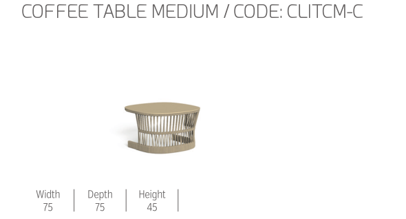 Il Tavolino da caffè medio della collezione Cliff Dèco è funzionale ed in pieno stile della collezione. Le corde nautiche sintetiche creano un piacevole gioco di ombre, rivestendo completamente la struttura in alluminio. L’ampio piano, anch’esso in alluminio, garantisce funzionalità al prodotto. Il Tavolino è pensato per essere accompagnato con gli altri Tavolini della collezione, grazie alla possibilità di incastrarsi tra di loro.