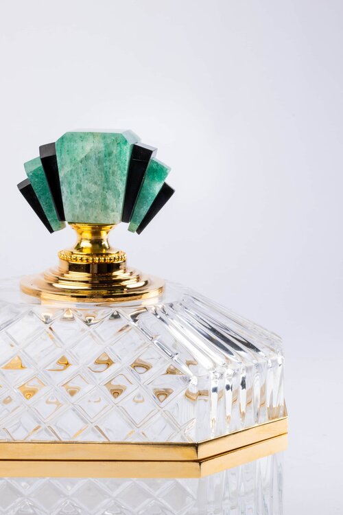 The diamond’s brightness of the french cut crystal exalts the deep color and grain of the stone. A jewel detail that embellishes this casket box in a perfectly Art Decò style and yet with a contemporary design. Each crystal is hand-cut and therefore unique.
