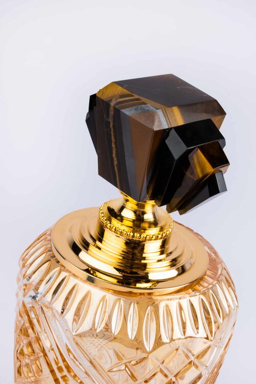 The diamond’s brightness of the french cut crystal exalts the deep color and grain of the stone. A jewel detail that embellishes the perfume bottle in a perfectly Art Decò style and yet with a contemporary design. Each crystal is hand-cut and therefore unique.