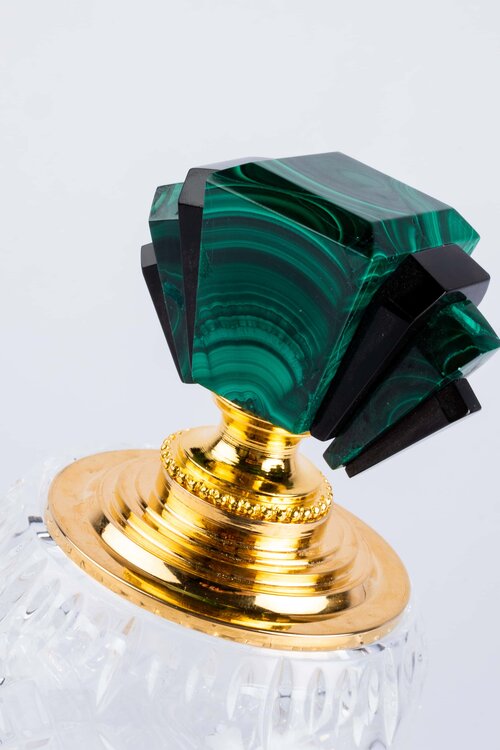 The diamond’s brightness of the french cut crystal exalts the deep color and grain of the stone. A jewel detail that embellishes the perfume bottle in a perfectly Art Decò style and yet with a contemporary design. Each crystal is hand-cut and therefore unique.