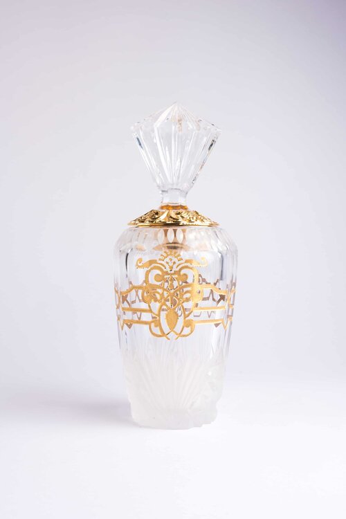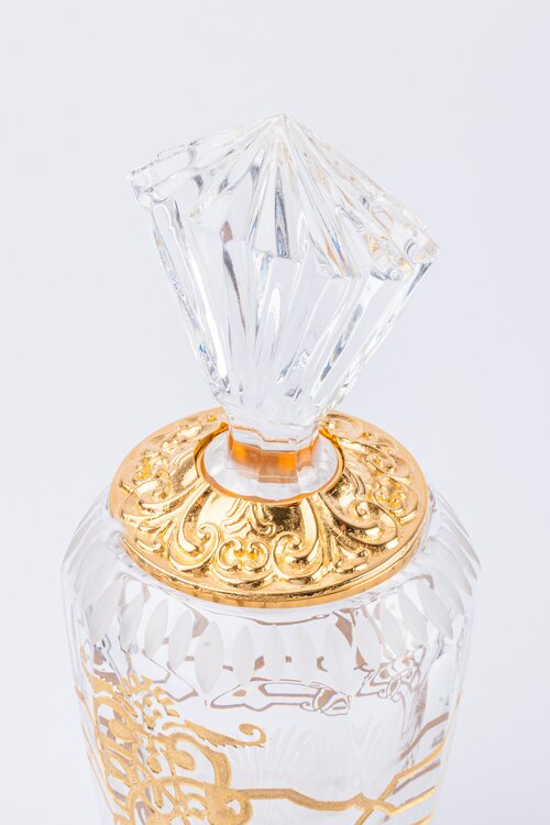 A vanity bottle made precious by a gilded motif in bas-relief inspired by the jewels of Catherine the great. Made unique by the play of light of the clear and matte french cut bevels of the crystal, that produce infinite reflections. Each piece is hand-cut and therefore unique.
