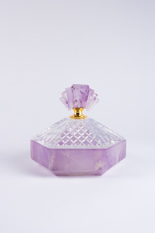 The diamond’s brightness of the french cut crystal exalts the deep color and grain of the quartz. A jewel detail that embellishes this hexagonal shaped amethyst casket box in a perfectly Art Decò style and yet with a contemporary design. Each piece is hand-cut and therefore unique. Available in three sizes.
