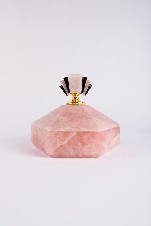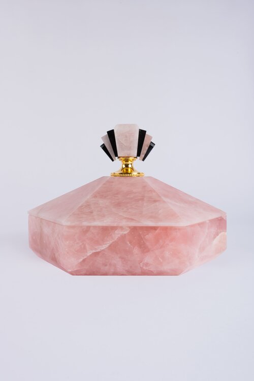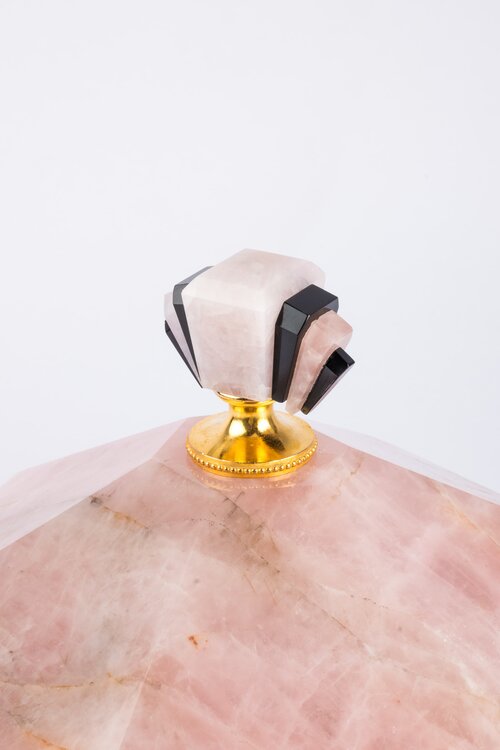 The delicate shade of pink quartz is exalted by the contrast of the black obsidian. A jewel detail that embellishes this hexagonal shaped casket box in a perfectly Art Decò style and yet with a contemporary design. Each piece is hand-cut and therefore unique. Available in three sizes.