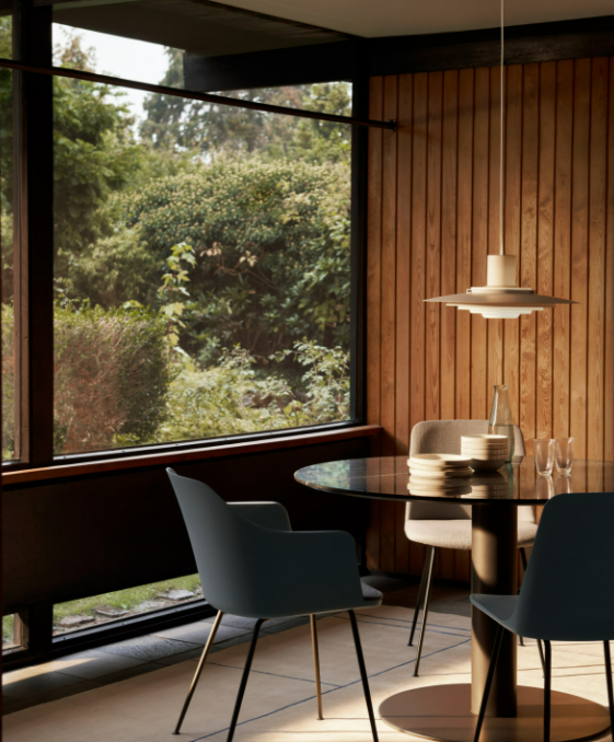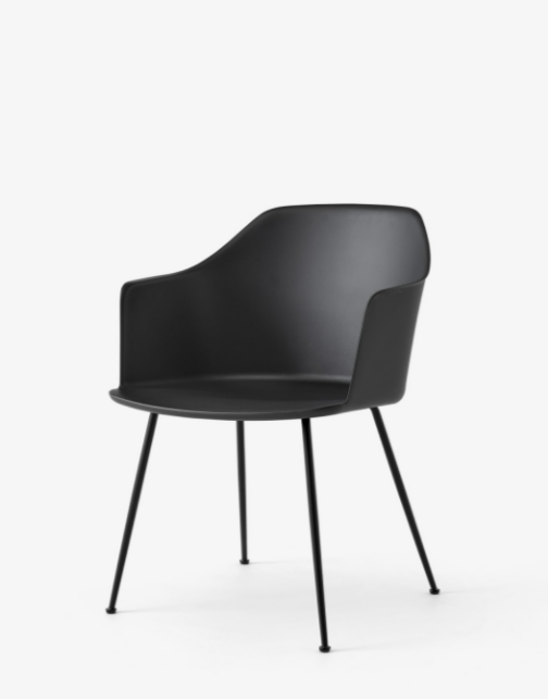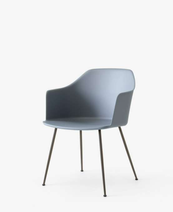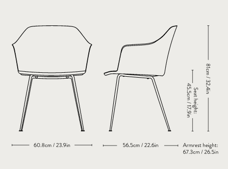 Veneer sheets formpressed together towards a solid wood insert. Milled into shape and lacquered. Natural Rattan weaved around a powder coated stainless steel frame.