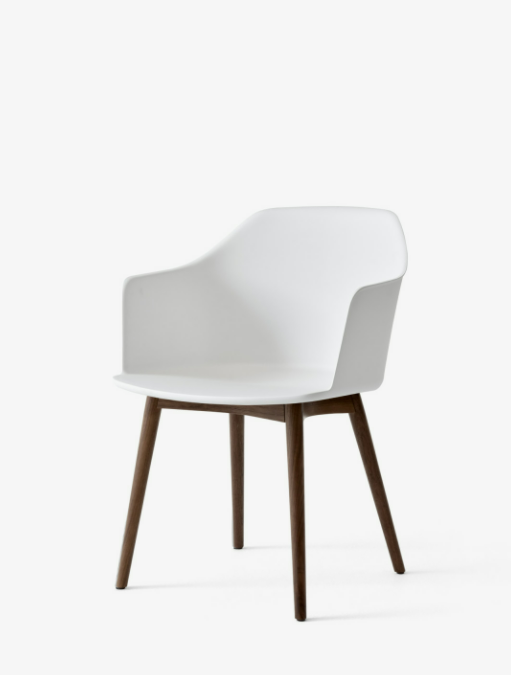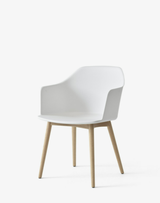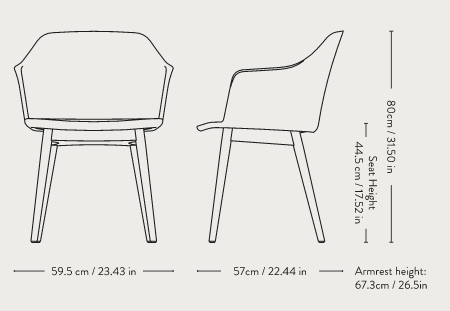 Veneer sheets formpressed together towards a solid wood insert. Milled into shape and lacquered. Natural Rattan weaved around a powder coated stainless steel frame.