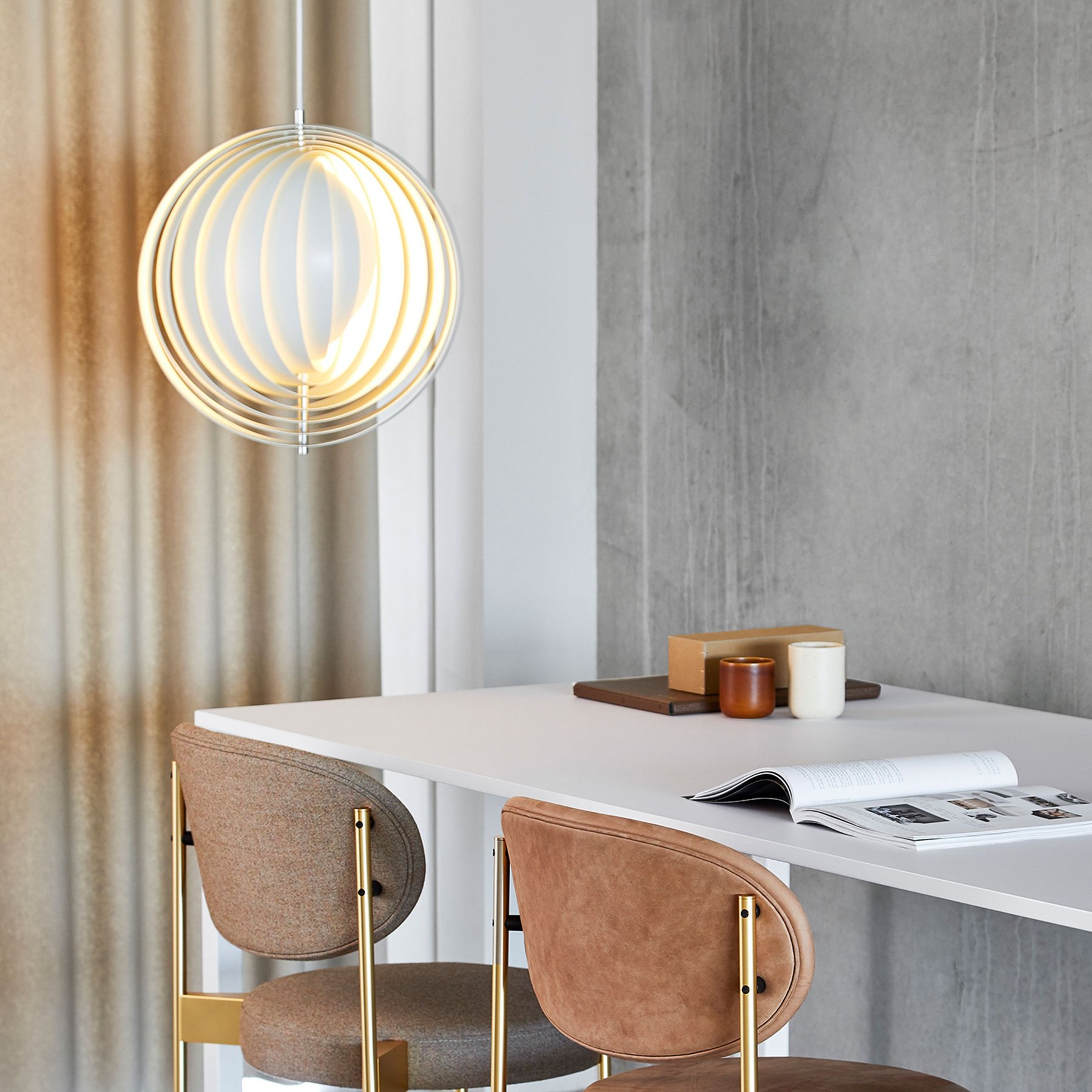 Designed in 1960, the Moon represents one of Verner Panton’s earliest designs in lighting. The iconic pendant is characterized by its fan-like design with ten ring-shaped aluminum lamellae perfectly positioned to provide a soft, ambient and glare-free light. The blades reflect and filters the light and the pendant changes its appearance depending on the angle at which you view it.