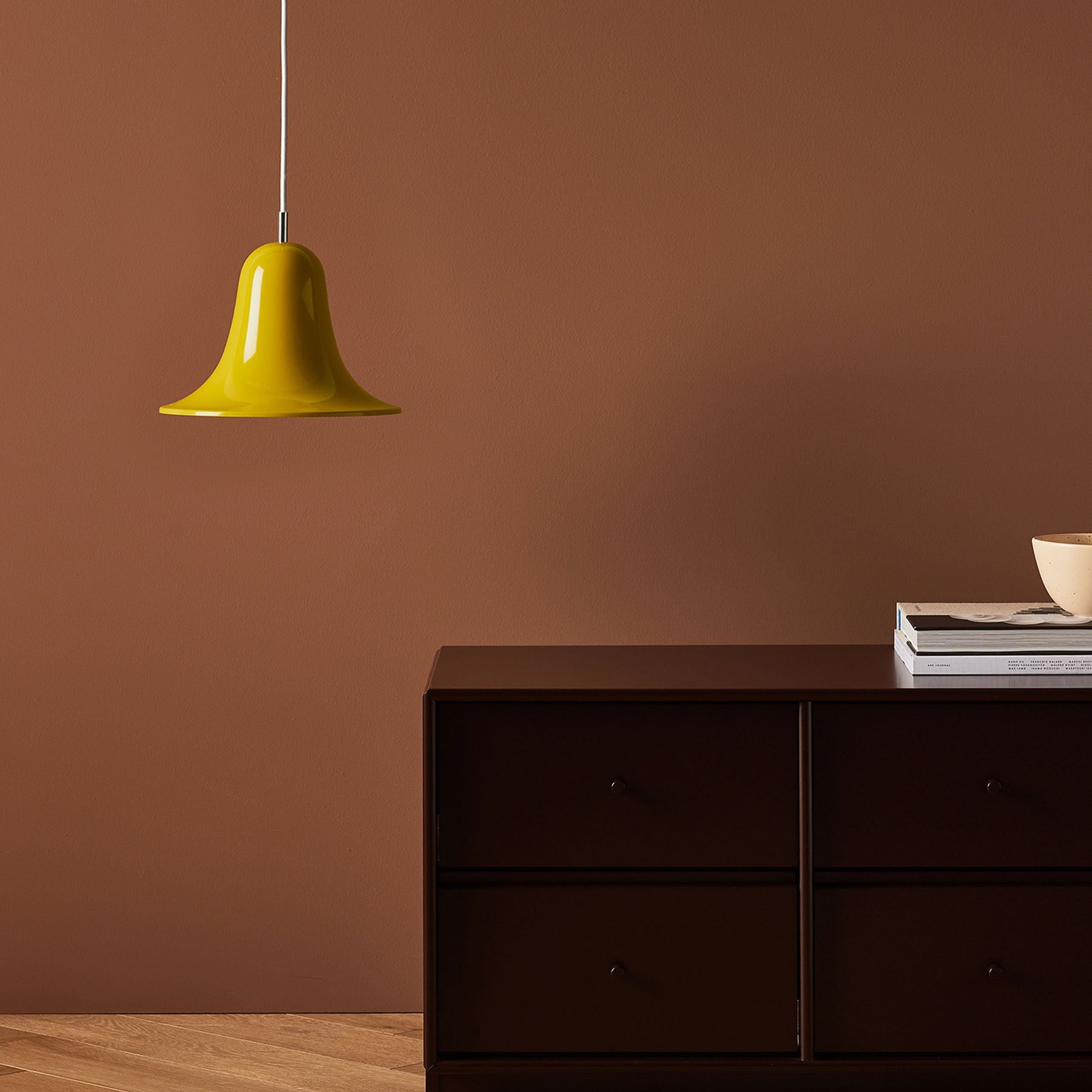 The elegant Pantop line was designed by Verner Panton in 1980, and has for a long time been a staple of the Verpan collection. Pantop is characterized by a bell-like, widely flaring shade which is mounted with the aperture facing down.