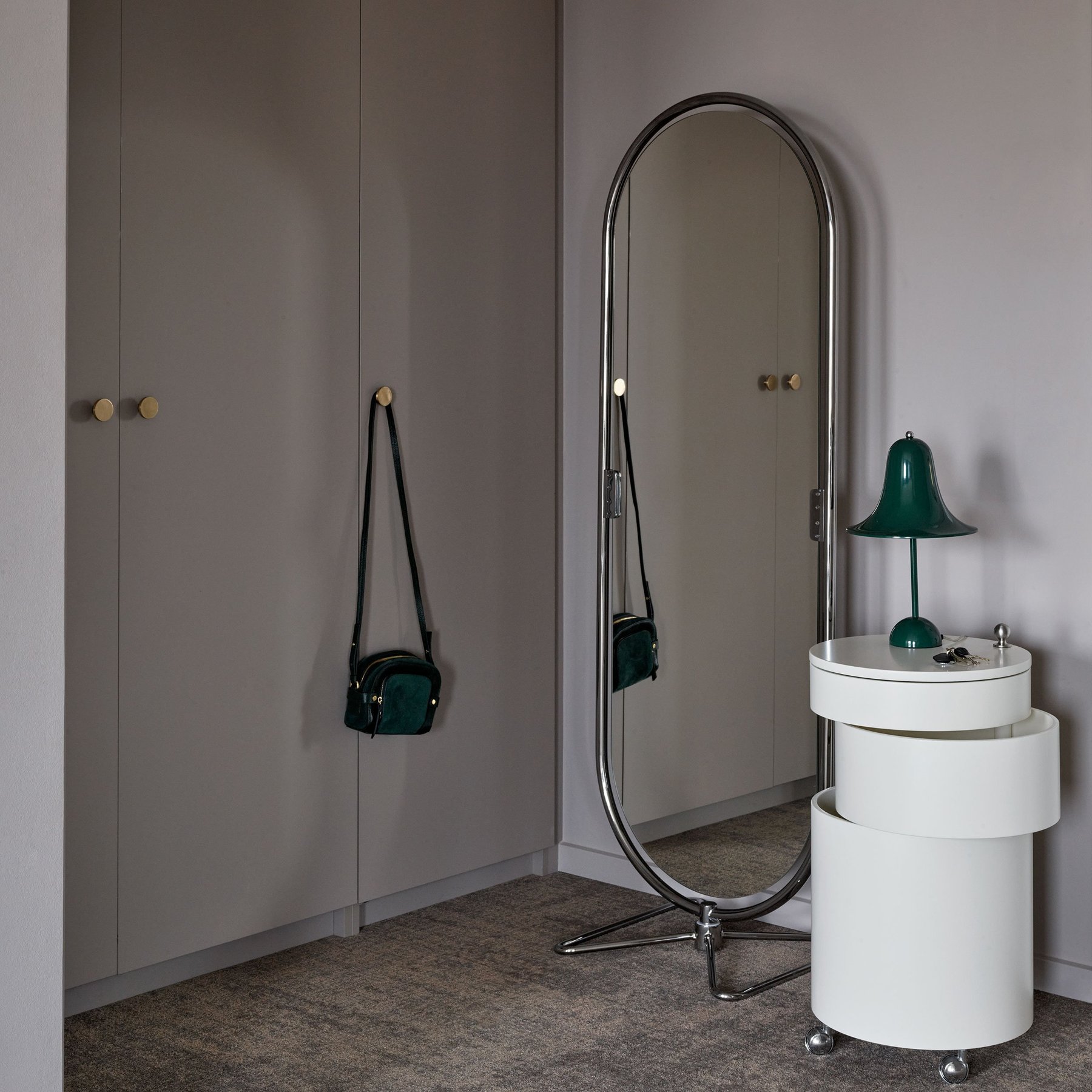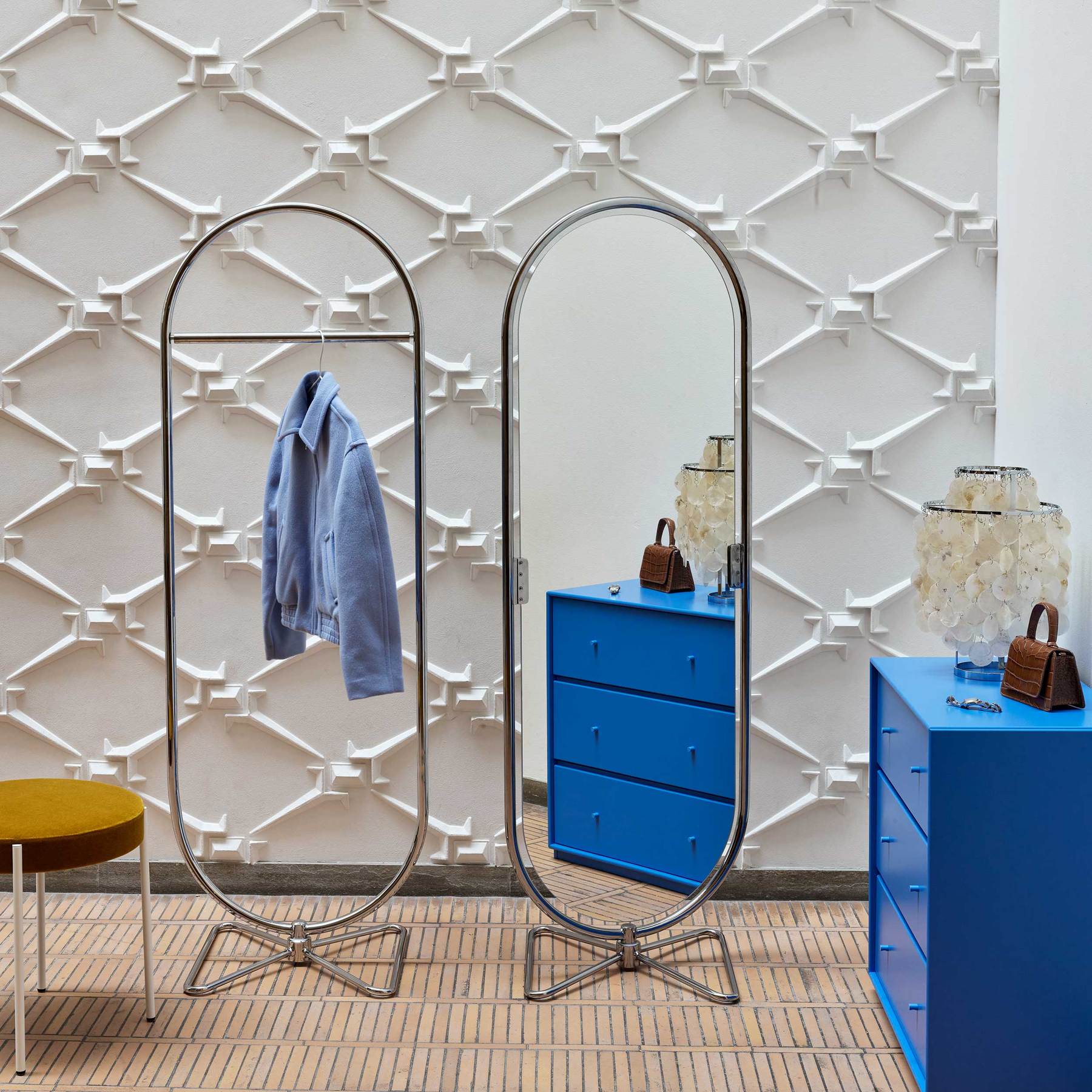Sharing features with the System 1-2-3 chairs, the System 1-2-3 Mirror is an elegant element for the wardrobe, bathroom or wherever there is a need for a stylish mirror. The design use an oval chrome plated frame and feature a mirror with tilt function. The System 1-2-3 Mirror sits on a butterfly base with swivel function.