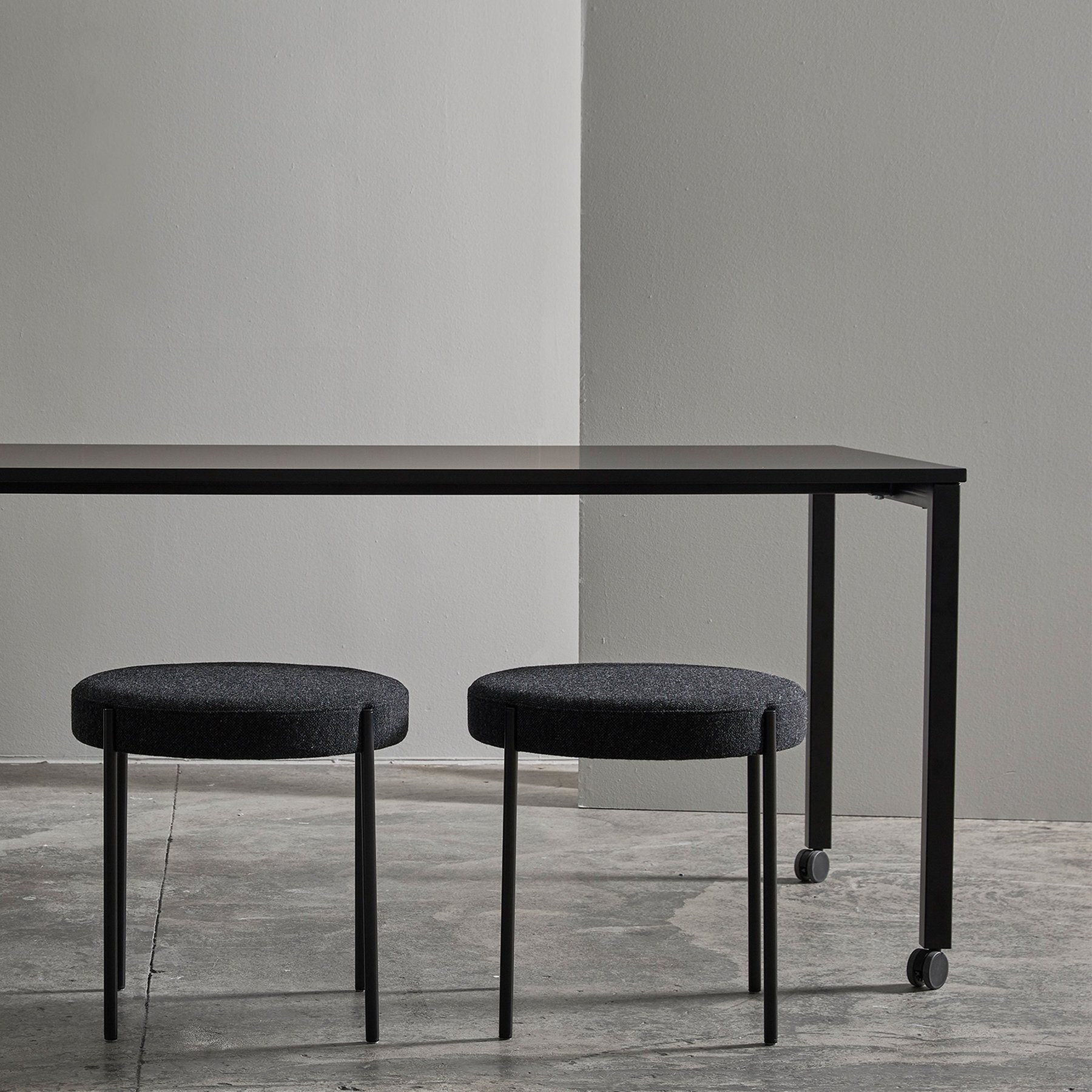 Verner Panton designed the Series 430 Stool as part of the Series 430 family. A study in simplicity, with a high level of comfort. He applied traditional webbing to the fully upholstered seat to adjust for body weight and placed it on a slender elegant frame that mounts on the outside of the seat. Use as a great extra seat for the dining table or as a stand alone piece.