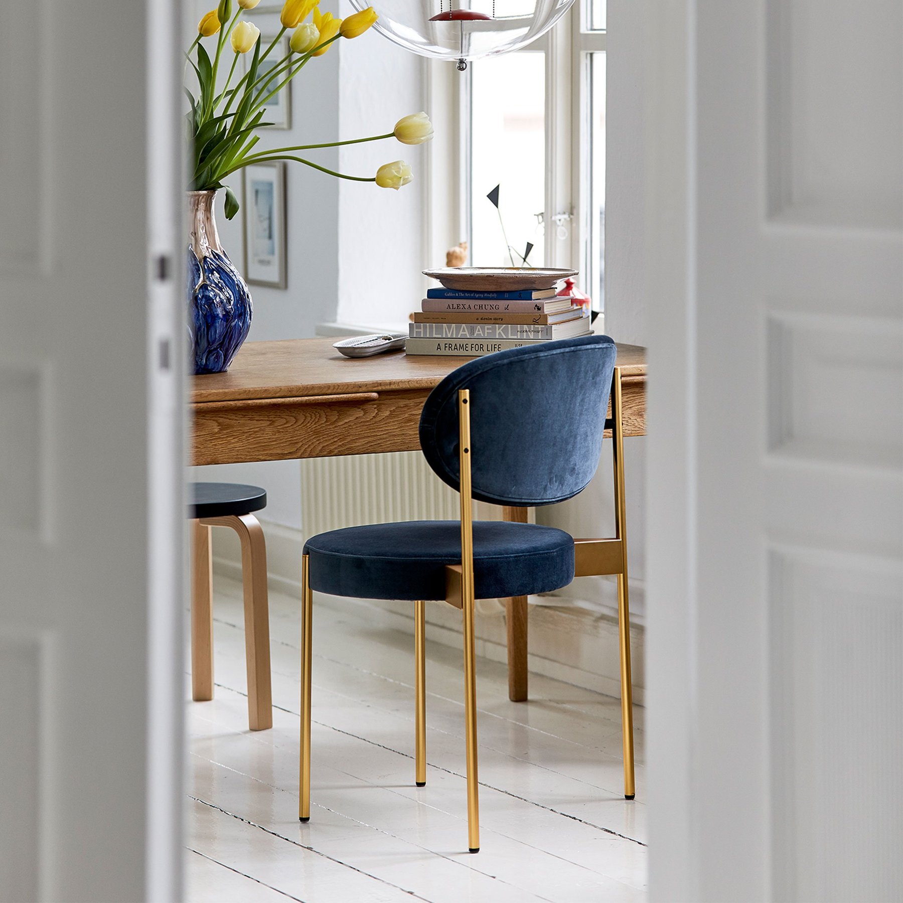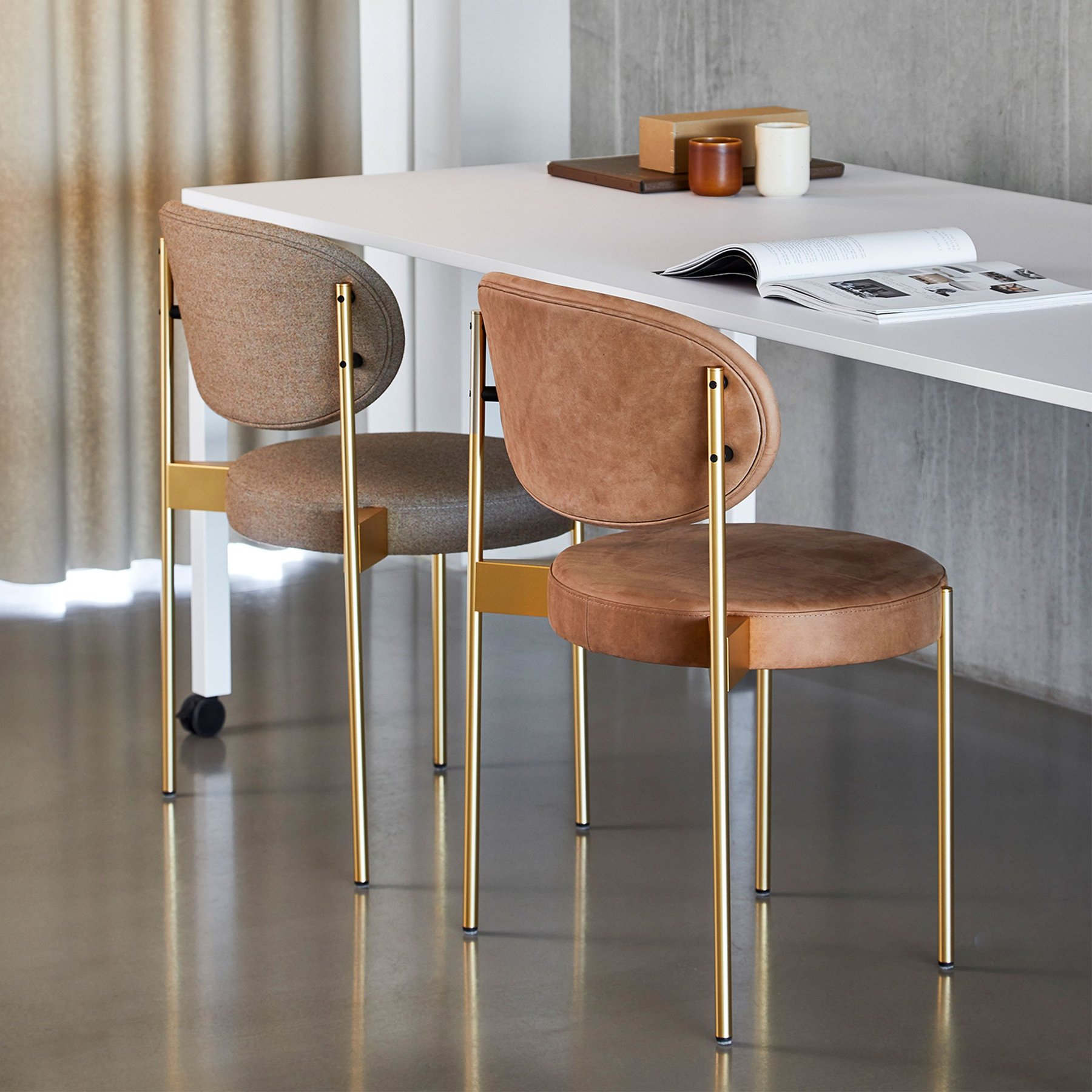 Verner Panton designed the Series 430 Chair as a study in simplicity, while providing the same comfort as an armchair. He did so by applying traditional webbing to the fully upholstered seat to adjust for body weight and create a wide nestling backrest and place it on a slender elegant frame that mounts on the outside of the seat and back.