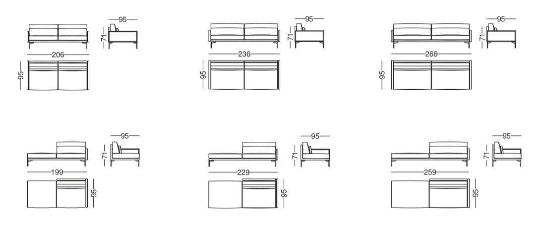 Proposed as a single sofa, its structure is made of solid Canaletto walnut wood or polished black lacquered wood; its base quits fabric covers to show its naked wooden structure.