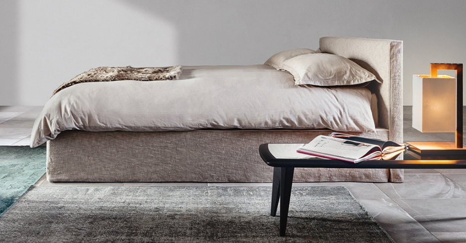 Vibieffe's 5400 Tangram is a large double bed available in different sizes and with completely removable cotton, linen, leather or custom covers. The cover is particularly highlighted on the bed's flanks and on the front. The bed can be lifted to access to a storage space underneath.