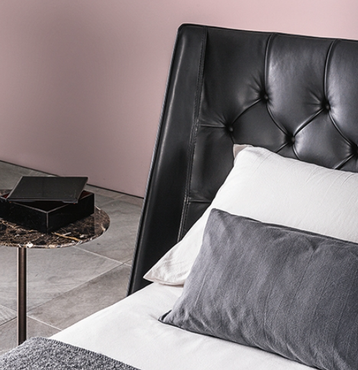 Vibieffe 5700 Opera is a double bed with a button-tufted headrest, available in different sizes and with leather covers. The bed base can be lifted to access the storage space underneath.