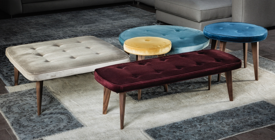 The 9300 Pancake ottomans are characterized by a design inspired by the combination between classical and contemporary elegance and by modular elements that can be freely combined. Designed in different shapes, they can be covered with a soft fabric or leather seat to become informal and comfortable ottomans, linear, colourful, portable and functional.