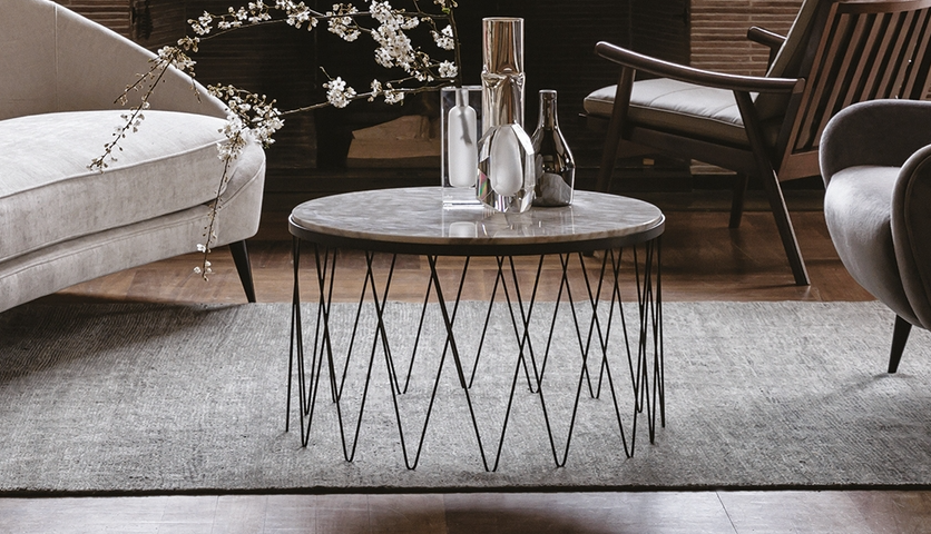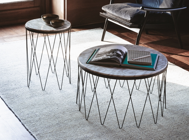 Vibieffe 9500 side tables 103, 104 are a series of round tables with different sizes and heights, which can be freely combined, available in multiple types of marble tops.