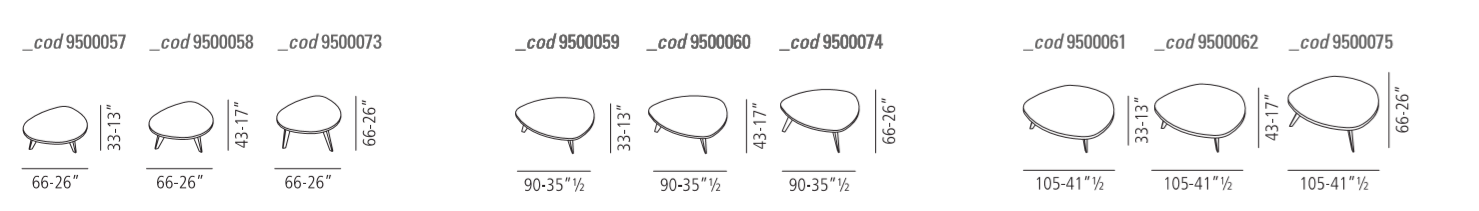 The 9500 coffee tables 057, 058, 59, 060, 061, 062, 073, 074, 075 are characterized by the smooth curved design of their wooden tops and contemporary and essential legs. They provide the ideal solution to complement sofas and armchairs. Available in multiple shapes and heights.