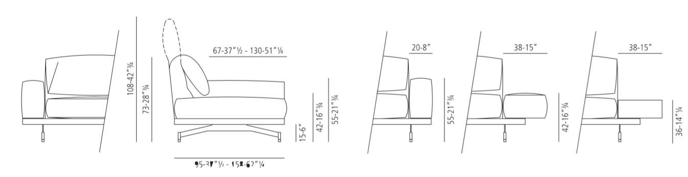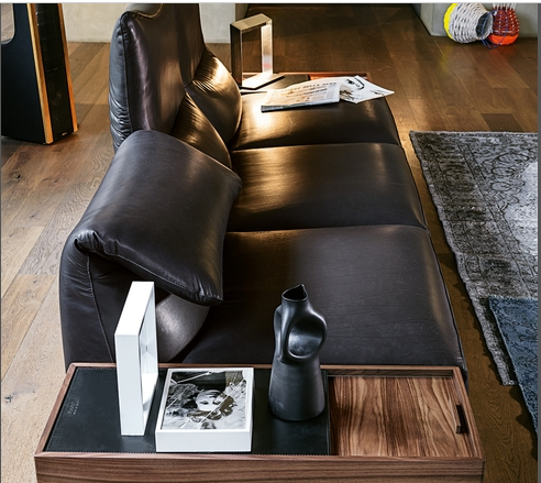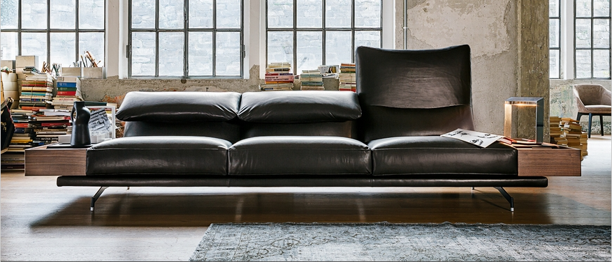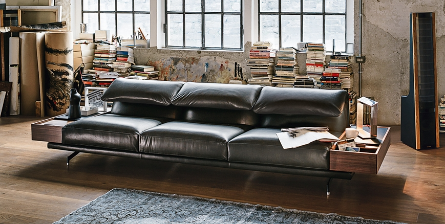 550 Altopiano is a customizable sofa and is available in three variants: with classic upholstered armrests, wing-like adjustable upholstered armrests or also with a Canaletto walnut wood small container in place of the armrest which can also be equipped with a designer lamp. It is available as a stand-alone sofa or completed with a comfortable chaise-longue.